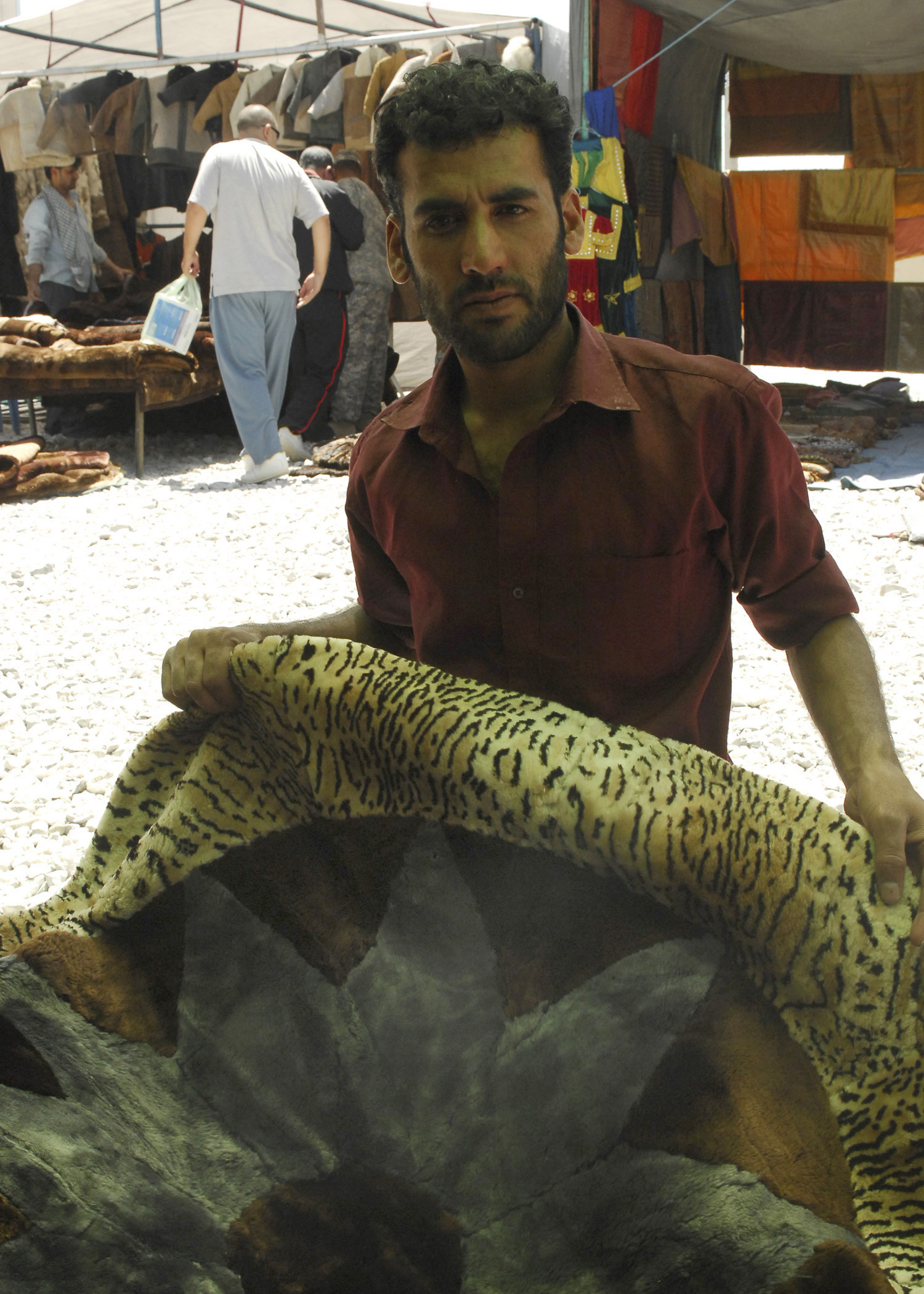 BAGRAM AIR FIELD, Afghanistan - A local vender shows rugs and blankets that he made by hand at the Bazaar, here July 17. The Bazaar is a fun way to connect the local people with the troops. (U.S. Air Force photo/Senior Airman Susan Tracy)