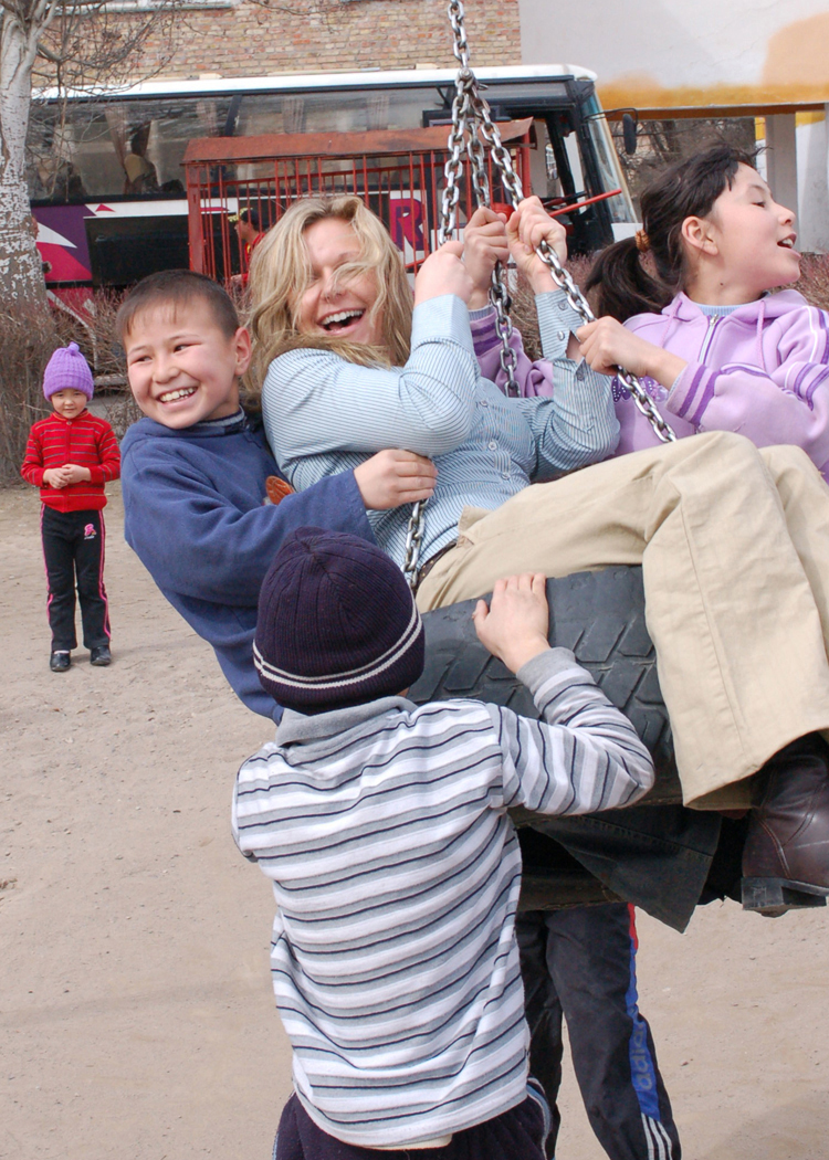 Senior Airman Courtney Clifford takes a tire swing ride with children at the Nizhanchuisk Orphanage March 15 near Manas Air Base, Kyrgyzstan. Airman Clifford is a vocalist with Sirocco, the U.S. Air Forces Central Expeditionary Band touring the AFCENT area of operations. While at Manas, Sirocco made visits around the local area to perform music for the children. Airman Clifford is deployed from the U.S. Air Forces in Europe Band at Sembach AB, Germany. Airman Clifford is originally from Goucester, Mass. (U.S. Air Force photo/Tech. Elizabeth Weinberg)