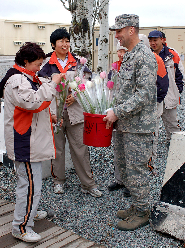 In honor of International Women's Day, Col. Christopher Bence, the 376th Air Expeditionary Wing commander, personally delivered fresh flowers March 7 to Kyrgyz women employed at Manas Air Base, Kyrgyzstan. More than 650 Kyrgyz contractors from the local area work on the base. (U.S. Air Force photo/Tech. Sgt. Elizabeth Weinberg)