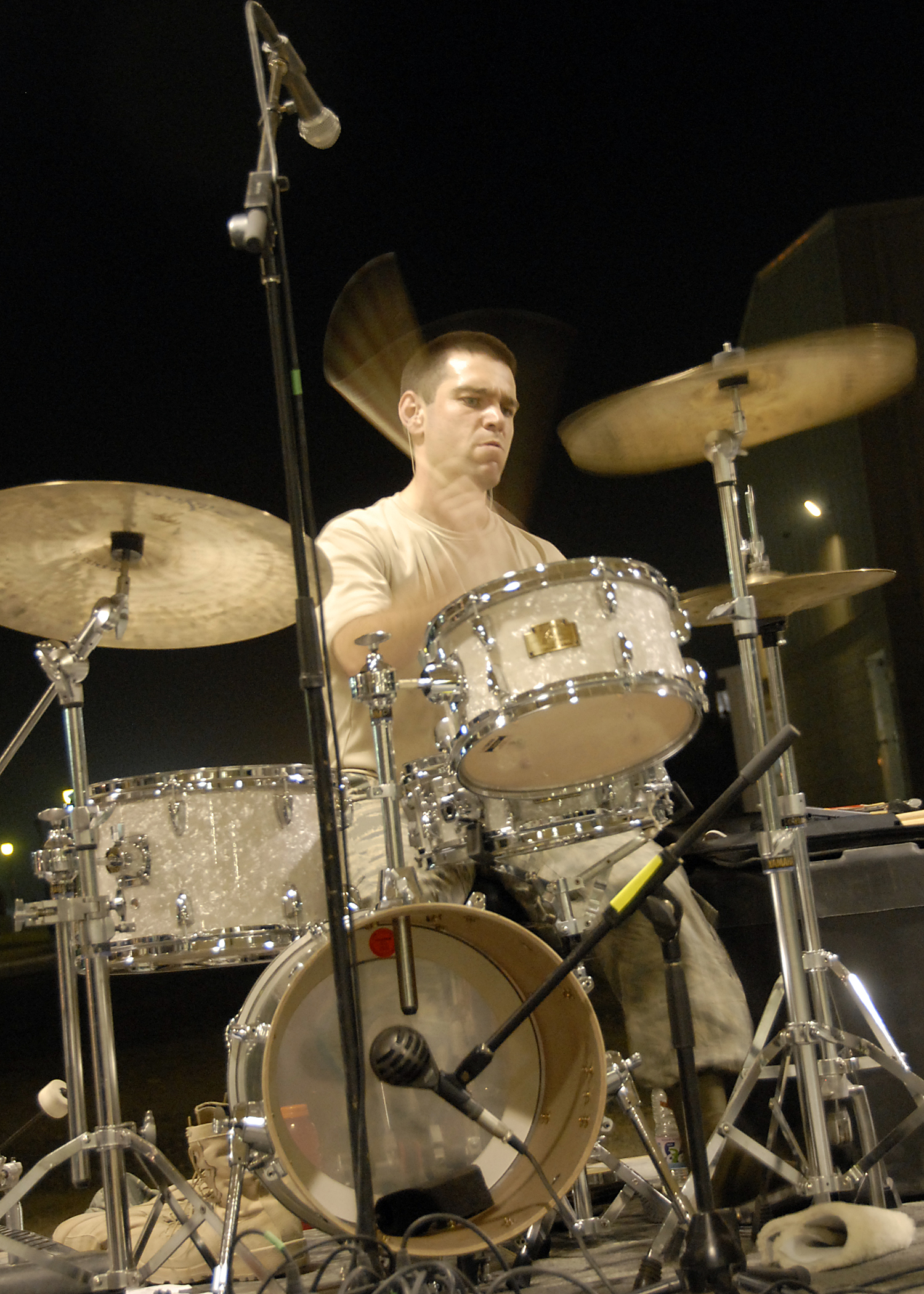 SOUTHWEST ASIA -- Senior Airman Steven Helfand, a drummer with the U.S. Air Force Central Command Band called Falcon rattles off a beat leaving the audience applauding for more during a recent performance at an air base in the Persian Gulf Region. The Falcon Band recently kicked off a 60-day tour throughout Southwest Asia and the Horn of Africa to positively promote troop morale, diplomacy and outreach to host nation communities. (U.S. Air Force photo/Tech. Sgt. Michael O'Connor)