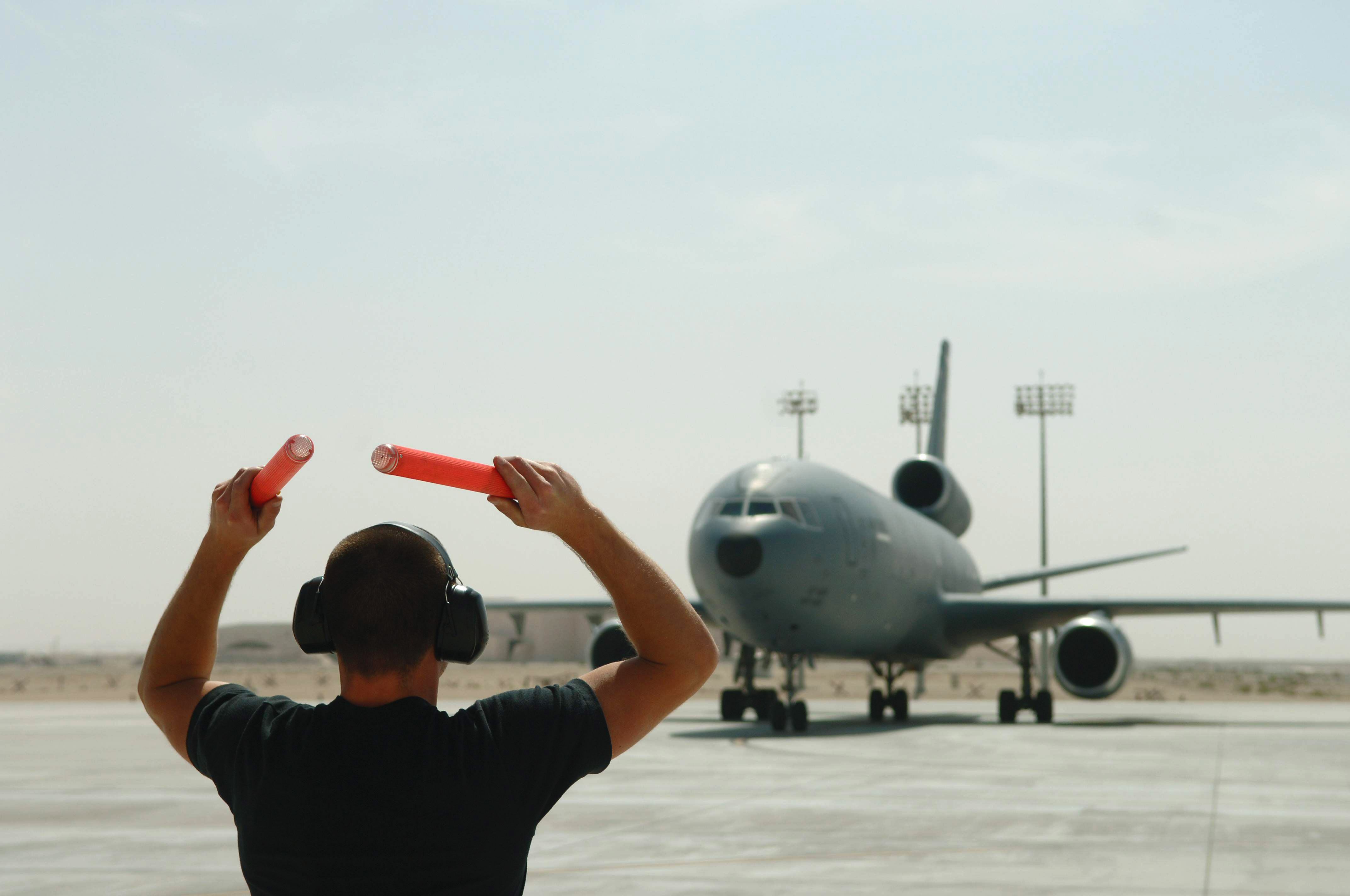 Senior Airman Douglas Martin marshals a KC-10 Extender from its parking space in order to launch for a mission March 27 at a base in Southwest Asia. Providing 6.5 million pounds of jet fuel weekly, the KC-10 and the Airmen of the 380th Air Expeditionary Wing who support it give global reach to U.S. and coalition aircraft supporting operations Enduring Freedom and Iraqi Freedom. Airman Martin is a 380th Expeditionary Aircraft Maintenance Squadron crew chief. (U.S. Air Force photo/Senior Airman Levi Riendeau)