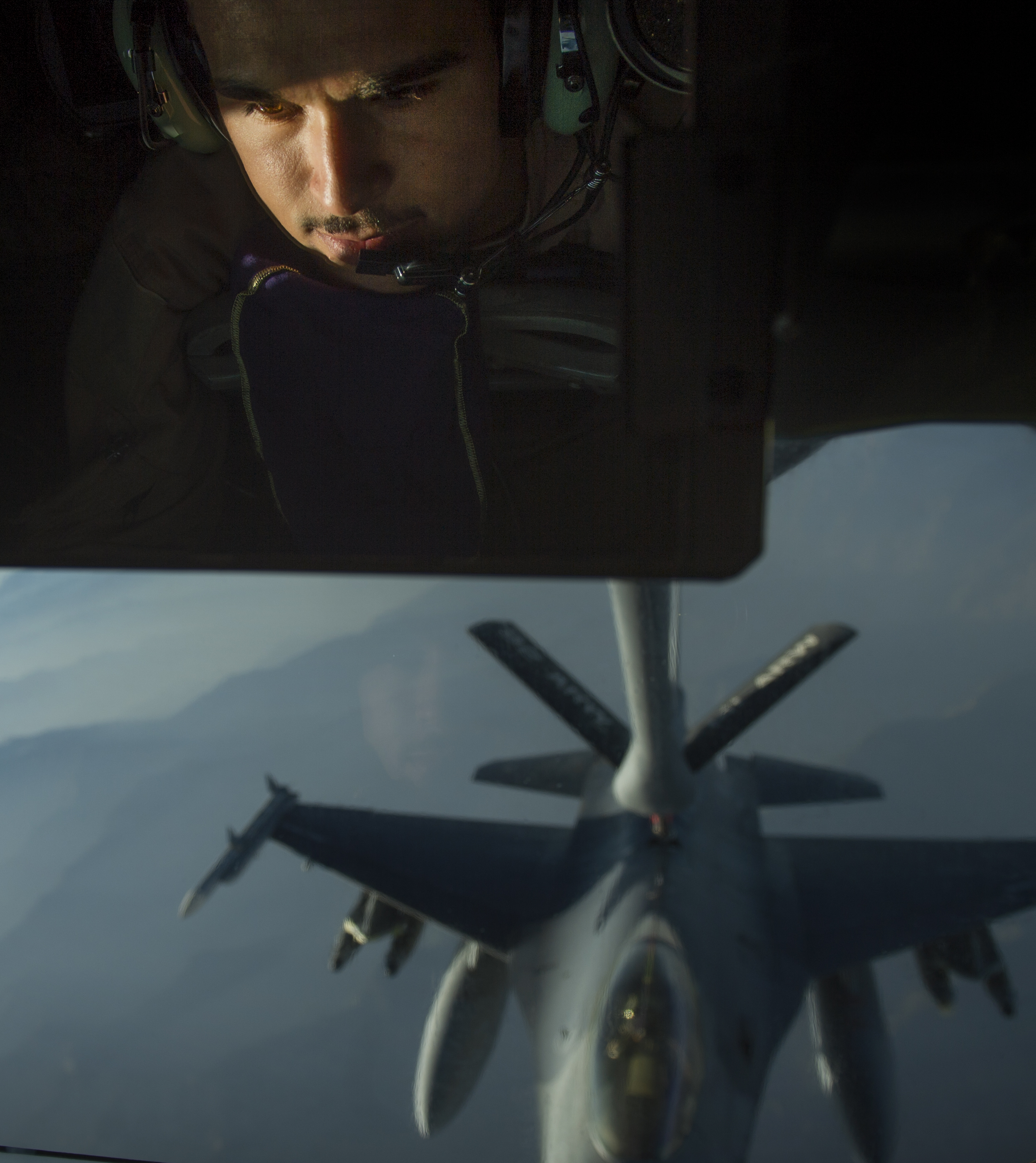 Airman 1st Class Jordan Gese, 340th Expeditionary Air Refueling Squadron boom operator, off-loads fuel to an F-16C Fighting Falcon during an in-air refueling mission over Afghanistan, July 22, 2014. Gese, an Aberndeen, South Dakota native, is deployed the 93rd Aerial Refueling Squadron, Fairchild Air Force Base, Washington. (U.S. Air Force photo by Staff Sgt. Vernon Young Jr./Released)