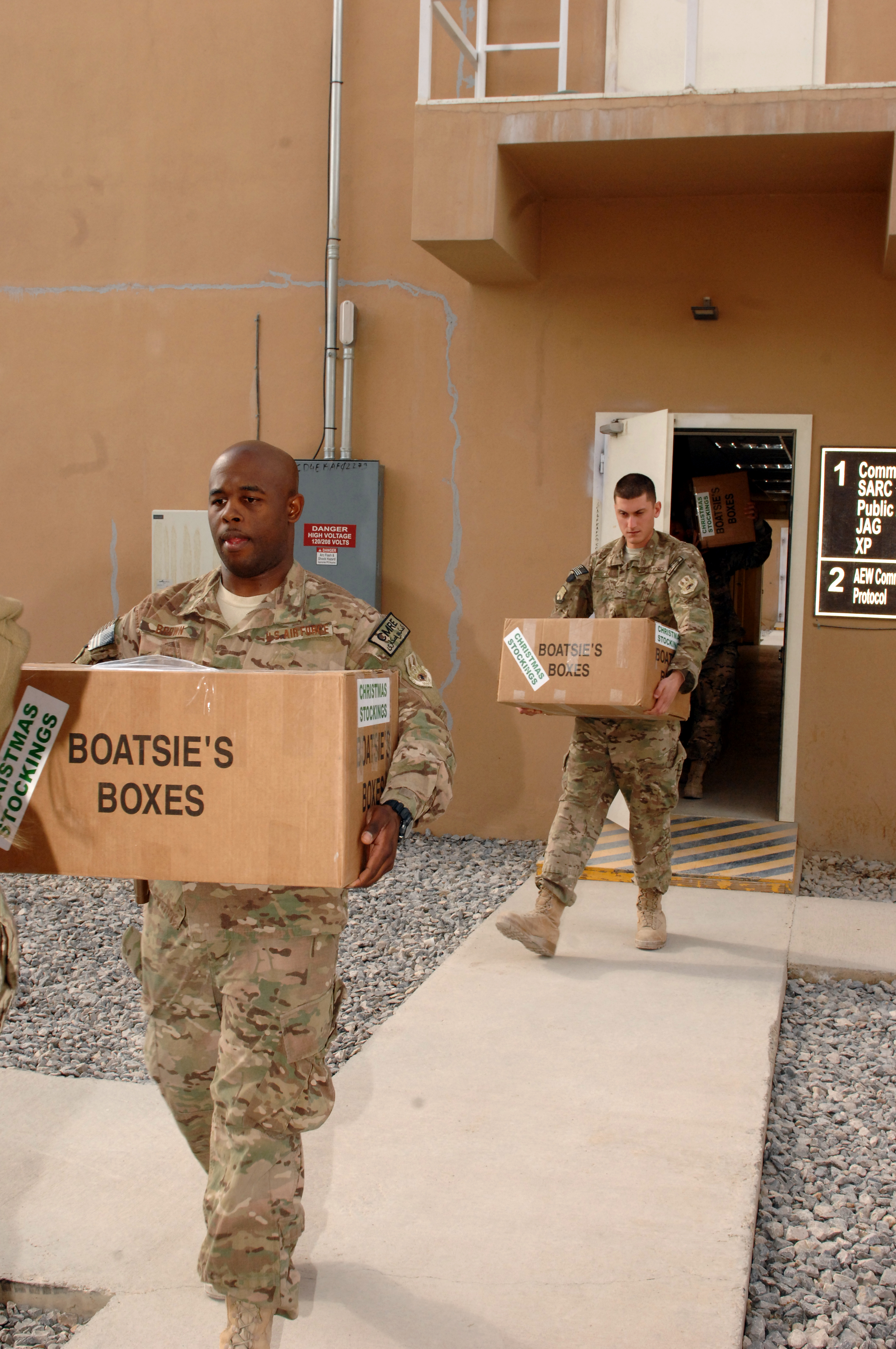 Airmen from the 451st Air Expeditionary Wing move boxes of stockings received from a charity, Boatsie’s Boxes Dec. 5, 2013. The boxes full of Christmas Stockings were distributed to Airmen around Kandahar Airfield, Afghanistan. (U.S. Air Force photo by Senior Airman Jack Sanders)