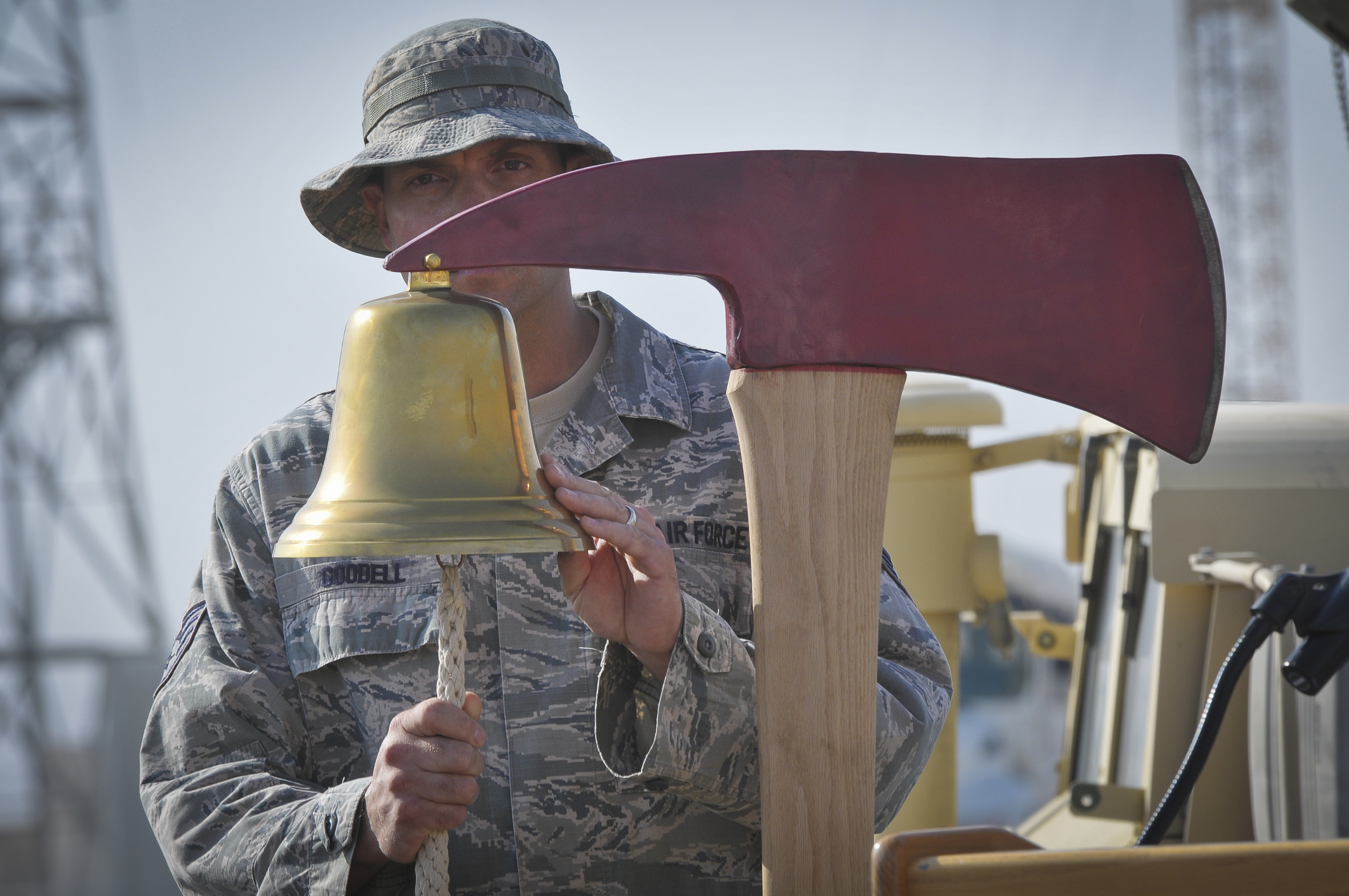Staff Sgt. Steven Goodell, a firefighter deployed to the 386thAir Expeditionary Wing, rings a bell nine times, a 3-3-3 cadence, in memory and tribute to the fallen firefighters of 9/11 during a 9/11 memorial ceremony at the 386th Air Expeditionary Wing in Southwest Asia. (U.S. Air Force Photo by 1st Lt. Nathan Wallin)