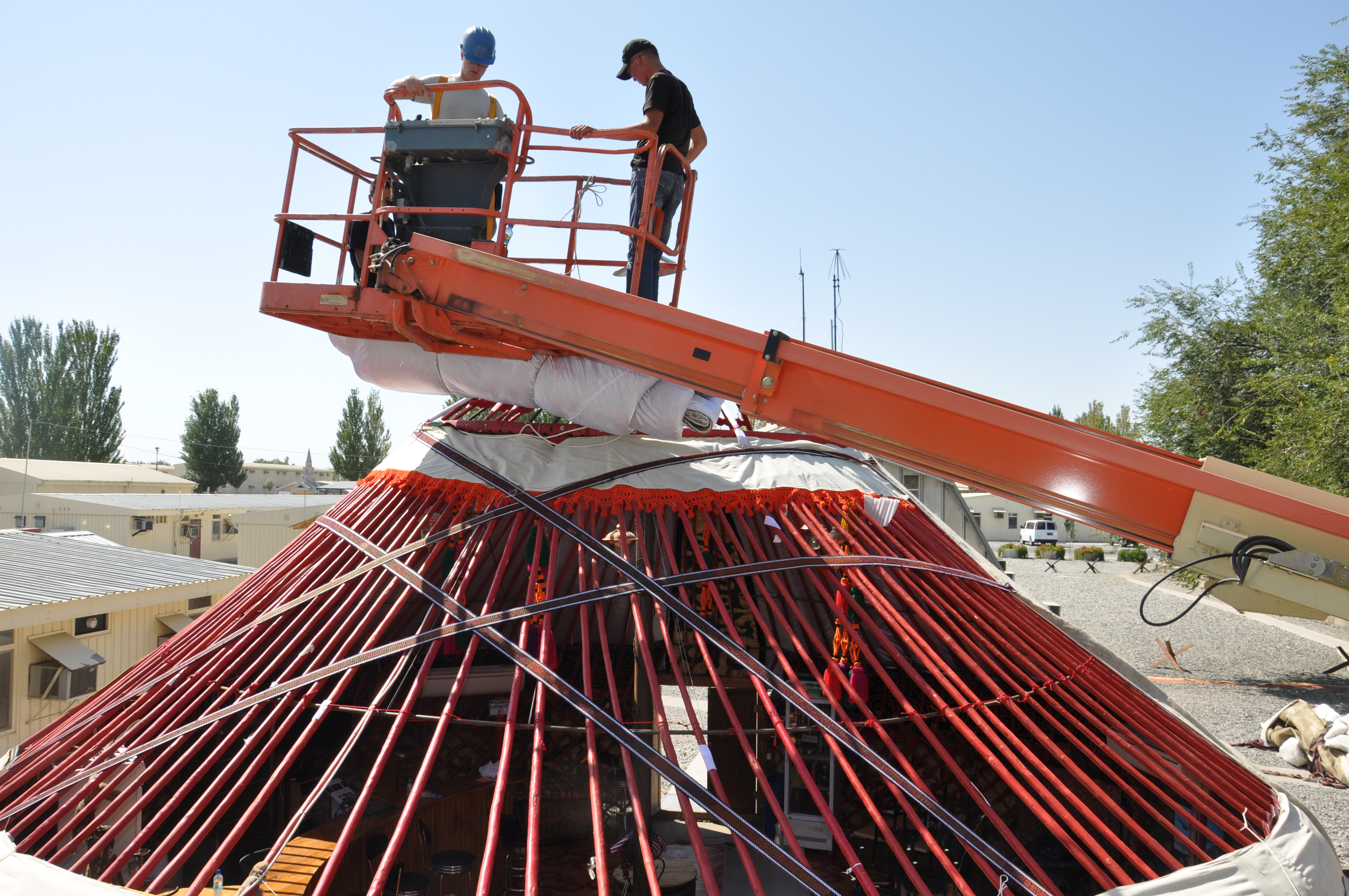 The Kyrgyz nomadic-style yurt on The Transit Center at Manas, Kyrgyzstan, receives a new cover Sept. 7, 2013. The work of a crew of laborers specializing in yurt building and repair was made easier with the help of the 376th Expeditionary Civil Engineer Squadron member who operated an aerial man lift raising the crew more than 17-feet in the air to reach the rooftop. The old cover was full of mildew and was disintegrating from years of weathering. (U.S. Air Force photo/Master Sgt. Donna T. Jeffries)