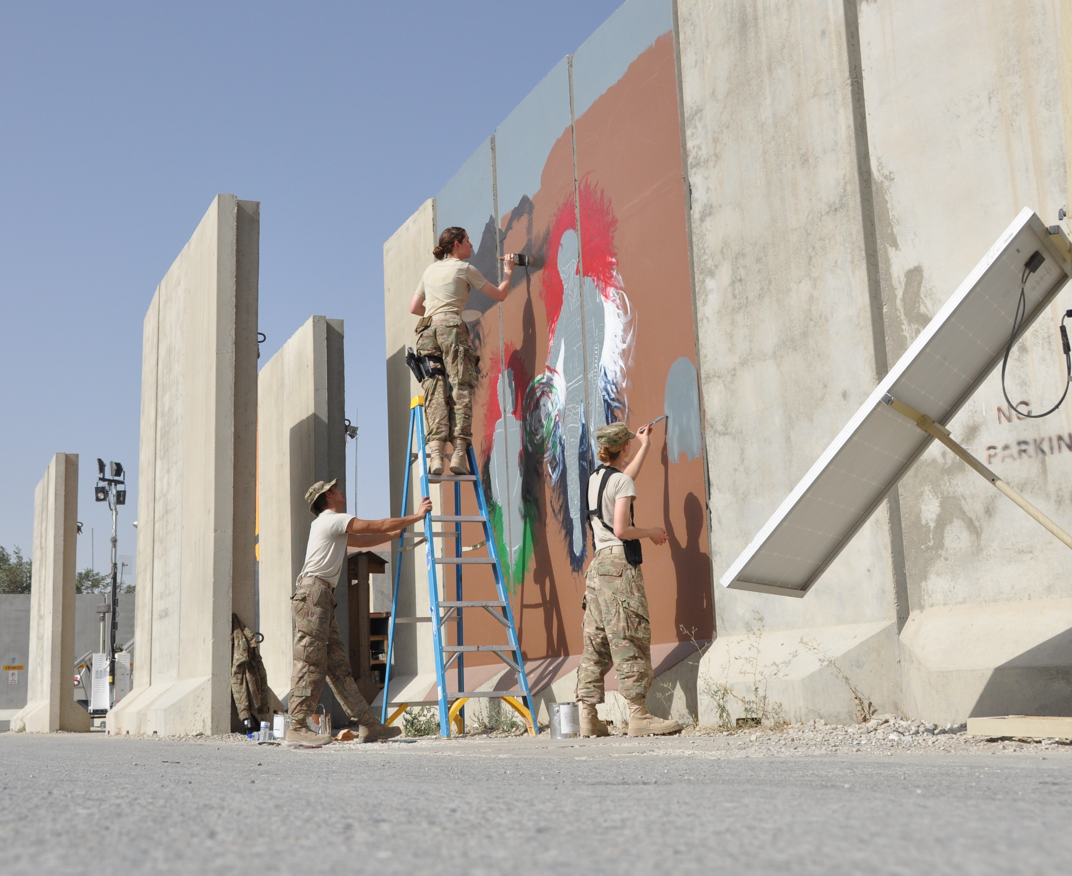 Airman 1st Class Eli Hixson, 455th Expeditionary Aerial Port Squadron air transportation passenger service agent, Senior Airman Brittney Snyder, 455th Air Expeditionary Wing personnel support, and Senior Airman Alyona Blizard, 455th Expeditionary Communications Squadron communications focal point technician, painted their interpretation of unity, respect, trust, strength and the will to protect on a wall leaving a visual legacy for those who follow in their footsteps to see here on Camp Cunningham Aug. 30, 2013. (U.S. Air Force photo/Tech. Sgt. Rob Hazelett)
