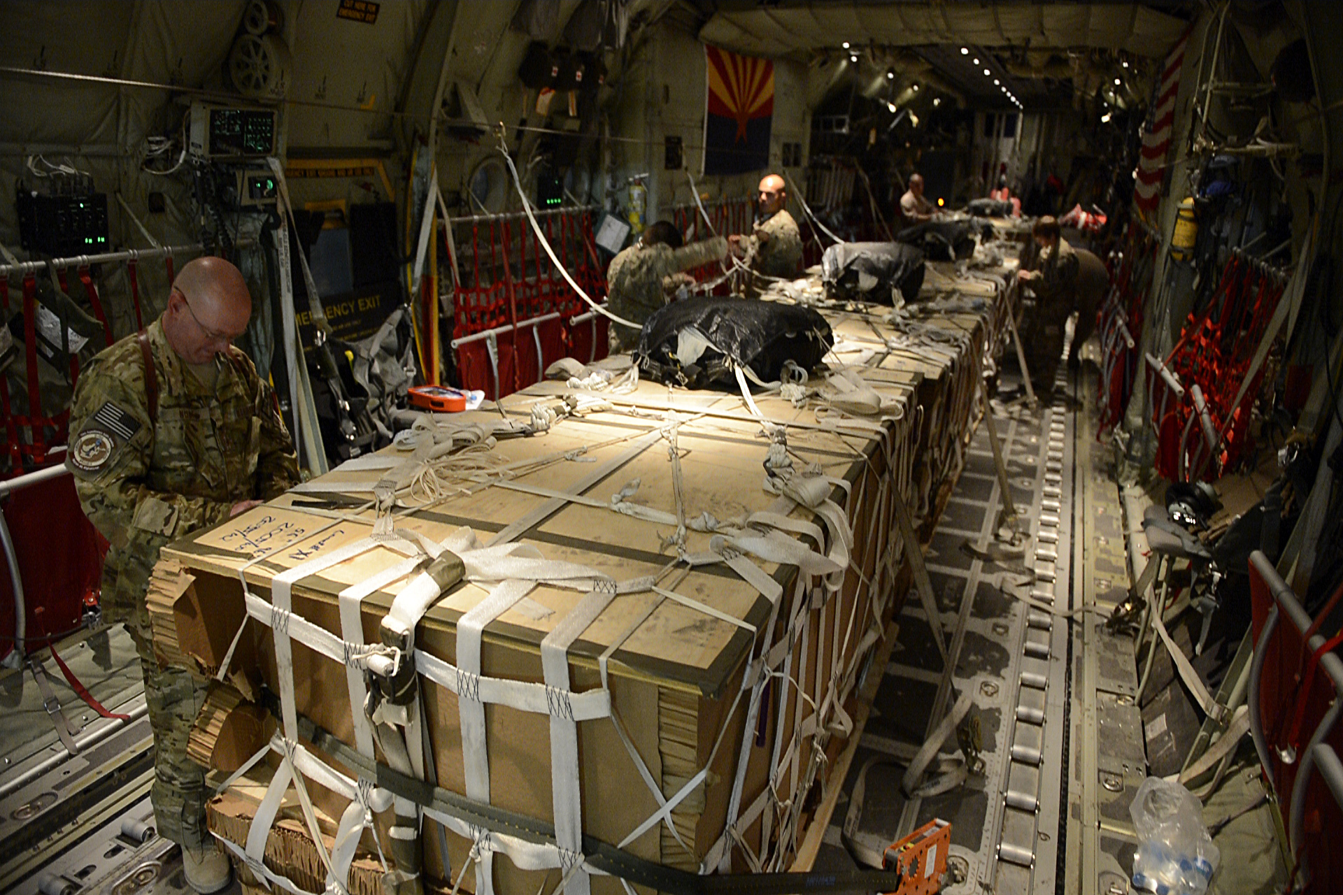 Master Sgt. Bradley Nulf, 774th Expeditionary Airlift Squadron evaluator loadmaster secures cargo for an airdrop at Bagram Airfield, Afghanistan Aug. 1, 2014. The squadron is using the new Wireless Gate Releases System for airdrops. The WGRS saves the Air Force in material, fuel costs and man hours. Nulf is deployed from Dyess Air Force Base, Texas and a native of Columbia City, Ind. (U.S. Air Force photo by Staff Sgt. Evelyn Chavez)