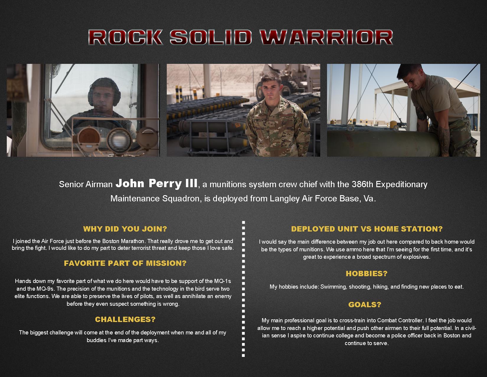 This week’s Rock Solid Warrior is Senior Airman John Perry III, a munitions system crew chief with the 386th Maintenance Squadron, deployed from Langley Air Force Base, Va. The Rock Solid Warrior program is a way to recognize and spotlight the Airmen of the 386th Air Expeditionary Wing for their positive impact and commitment to the mission. (U.S. Air Force graphic by Tech. Sgt. Jonathan Hehnly)