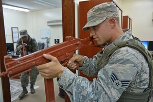Senior Airman Nickolauss Guier, a 386th Expeditionary Logistics Readiness Squadron fuels systems journeyman, looks through a refractometer while conducting a Fuel System Icing Inhibitor test at an undisclosed location in Southwest Asia, Dec. 1, 2015. The POL flight is responsible for providing fuel