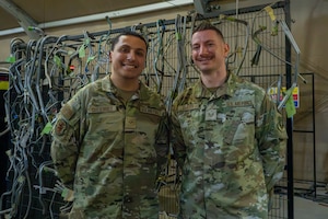 U.S. Airmen assigned to the 380th Expeditionary Logistics Readiness Squadron perform a joint inspection on an Army high mobility artillery rocket system vehicle in the U.S. Central Command area of responsibility, Jan. 12, 2026. C-130s and C-17s are typically used for HIMARS air transport,