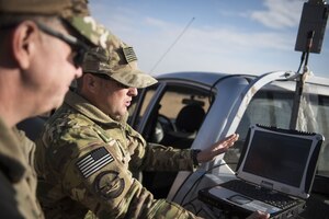 Tech Sgt. Matthew Coutts, assigned to the 332d Expeditionary Security Forces Squadron, demonstrates the capabilities of the Raven B Digital Data Link drone for Brig. Gen. Kyle Robinson, 332d Air Expeditionary Wing commander, Jan. 24, 2018 in Southwest Asia. The 332d ESFS uses the Raven B to monitor