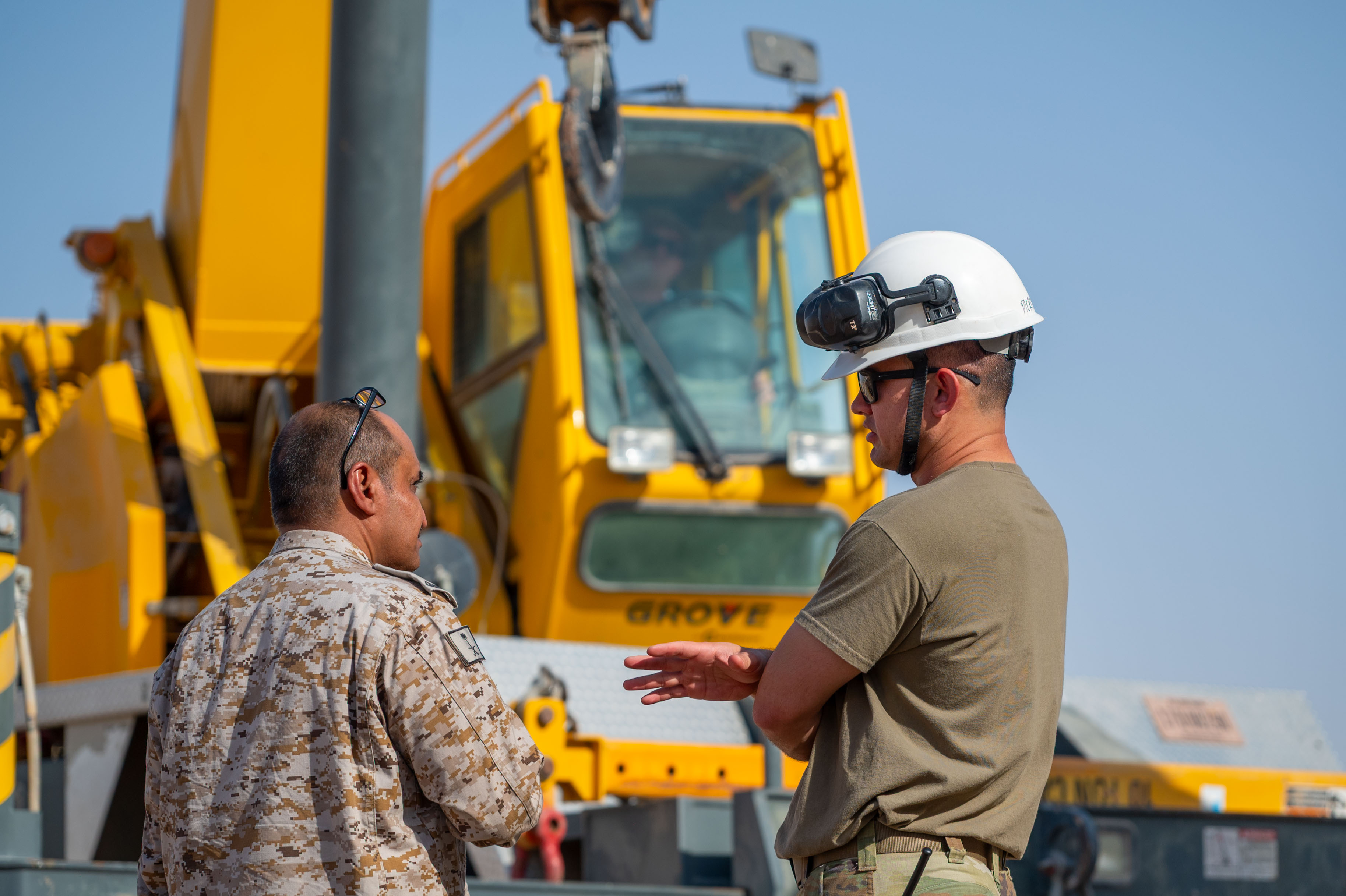 Right, U.S. Air Force Master Sgt. Patrick McParlane, 378th Expeditionary Maintenance Squadron flight chief, discusses operations with a Royal Saudi Air Force service member during a Crash, Damaged, Disabled, Aircraft Recovery exercise within the U.S. Central Command area of responsibility, July 24, 2025. USAF and RSAF service members regularly participate in exercises like these to showcase our ability to operate in a high-intensity environment, improving readiness, responsiveness and interoperability. (U.S. Air Force photo by Staff Sgt. Kevin Dunkleberger)