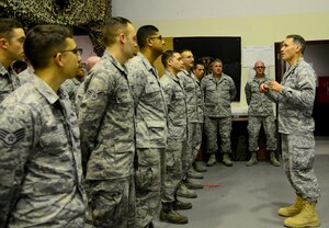 U.S. Air Force Chief of Safety Maj. Gen. Kurt Neubauer, right, speaks to Airmen from the 9th Expeditionary Aircraft Maintenance Unit during his visit, Dec. 2, 2014, to Al Udeid Air Base, Qatar. Neubauer recognized the 9th EAMU Airmen for their nomination for the Air Combat Command Aviation