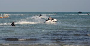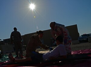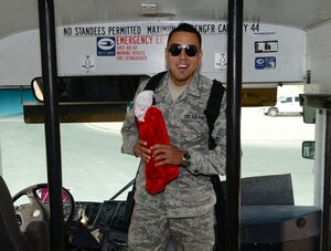 U.S. Air Force Chief of Chaplains, Maj. Gen. Howard Stendahl, right, coins Senior Airman Marilyn Mendoza, 379th Expeditionary Operations Group knowledge operations , during his visit, Dec. 21, 2014, at Al Udeid Air Base, Qatar. Mendoza, the 379th EOG’s top performer, is deployed from Langley Air