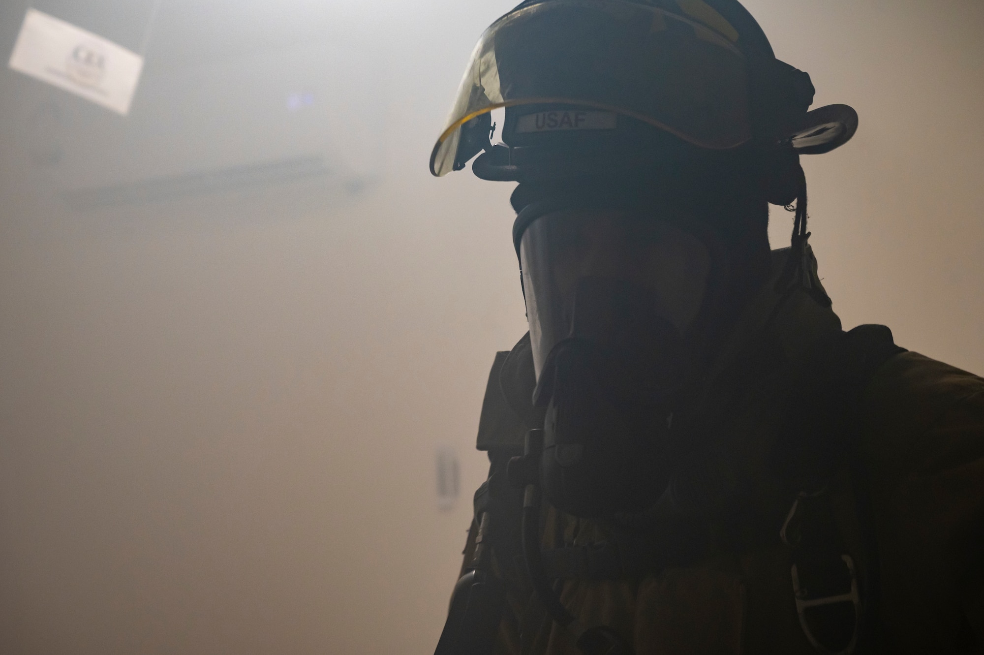 U.S. Air Force firefighters assigned to the 379th Expeditionary Civil Engineer Squadron respond to a simulated fire inside of a dormitory at Al Udeid Air Base, Qatar, Dec. 14, 2021. The dormitory was simulated to be on fire and was evacuated during Grand Shield 22-2, an exercise that was meant to test Al Udeid’s ability to respond to various scenarios. (U.S. Air Force photo by Senior Airman Noah D. Coger)