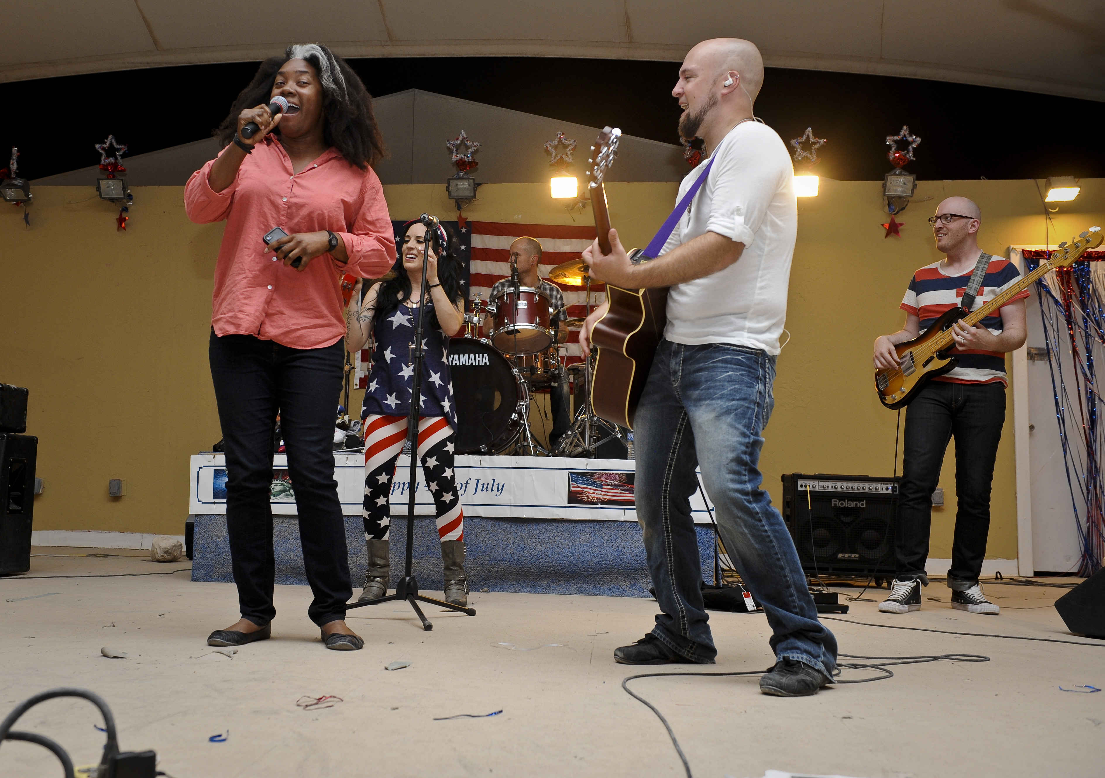 The Ringers lead singer, Kat Perkins, serenades 379th Air Expeditionary Wing service members during the July Fourth celebration at the 379th AEW in Southwest Asia, July 4, 2013. The Ringers are a wedding and event band on tour from Minneapolis, Minn., and are back by popular request. Along with playing in this group, Kat fronts the award-winning, internationally-recognized Twin Cities based, Scarlet Haze and has been in the industry since she was 15 years old. Grand Slam service members enjoyed music in genres ranging from Rock and Pop to Country and Rhythm and Blues with titles tailored for celebrating America?s freedom. (U.S. Air Force photo/Senior Airman Benjamin Stratton)