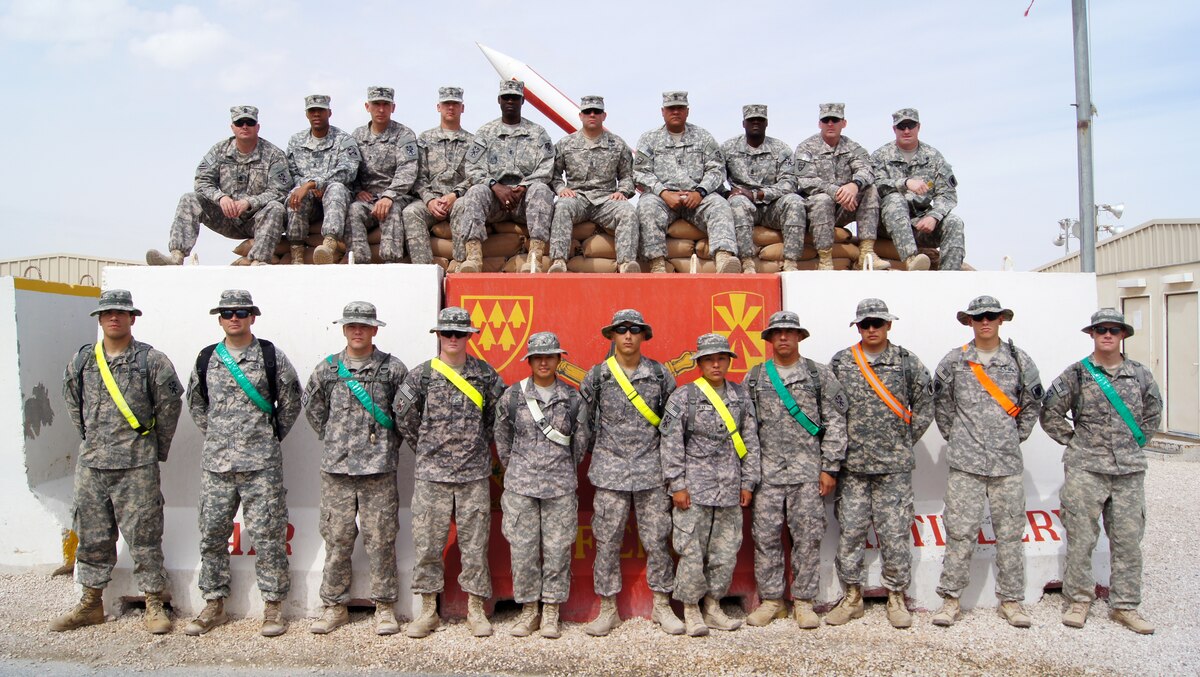 Echo Company 1st Sgt. Christopher Moreno motivates Pfc. Sharon Douglas as she endures the final leg of the recent “Tough Cobra” event at the 379th Air Expeditionary Wing in Southwest Asia. This event was all part of the 1-43 Air Defense Artillery Battalion’s “Best Cobra Competition.” (U.S. Army photo/Sgt. Daniel J. Baylor)