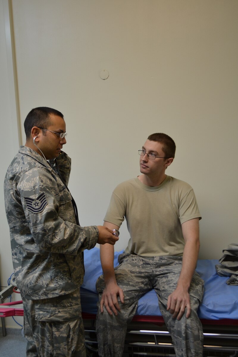 Medics Keep 64 AEG Healthy, On Task Published Jan. 24, 2013 By Chief Master Sgt. James Dowell 64th Air Expeditionary Group SOUTHWEST ASIA -- In the 64th Air Expeditionary Group, four medics work hard to keep the populace of the base healthy and on the job. "The Medical Liaison Flight is tasked with a variety of missions," said Master Sgt. Heather Hodge, flight NCOIC. "These include serving as a liaison between the 64th AEG and a mission partner organization that provides our Airmen medical care. We also track immunizations, physical profile changes and referrals for advanced care off station." Additionally, the flight provides food facility inspections for six eating locations, and teaches food handling courses, tracks animal bites and performs water testing for 800 facilities on base. Factor in the need for each medic to be cross-trained in tasks outside of their normal specialty and the complexity grows. For example, there is no medical logistician on staff, but all the medics maintain the complex supply function to high standards. There is no bioenvironmental technician, yet public health technician Staff Sgt. DeSean Jones, NCOIC of public health learned how to test water samples. "I was surprised but pleased to learn I'd have bio-tech duties when I got here," Jones said. "It's very precise work and I enjoy it." Hodge said health and wellness is paramount to mission success. "First and foremost, we keep the 64th AEG and our mission partners healthy, so they can perform their duties," said Hodge. "As medics, we have broadened our skill set in ways that we normally wouldn't get at home station or a larger clinic. And the leadership opportunities are second to none." Independent duty medical technician Tech. Sgt. Oscar Salas said the deployment tempo to keep deployers healthy and on-mission provides him a unique opportunity to expand his functional capabilities "The favorite part of my deployment to Eskan is being allowed to perform to the full scope of practice for my specialty," said Salas. "Being an independent medical technician comes with a lot of responsibilities and I am glad to shoulder them all in support my fellow Airmen." Their dedication to service does not go unnoticed. "The outstanding medical support provided by Master Sergeant Hodge and her highly skilled team of combat medics has enhanced patient care and a renewed cooperation between five different organizations across the 64th AEG," said Lt. Col. David Sieve, 64th Expeditionary Support Squadron commander. "I'm proud of their hard work and dedication to keep us healthy so we can execute our mission of 'fight the base.'"