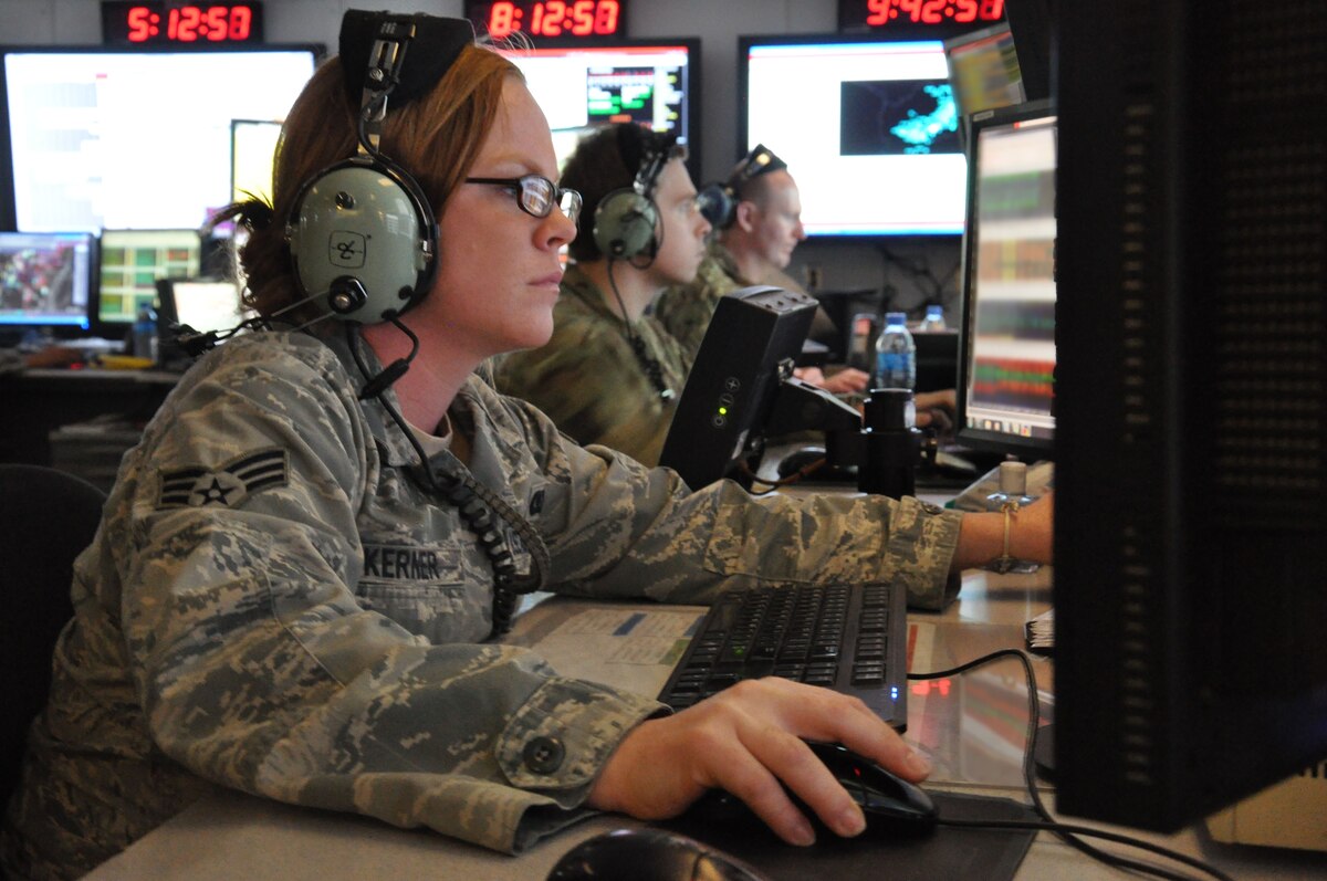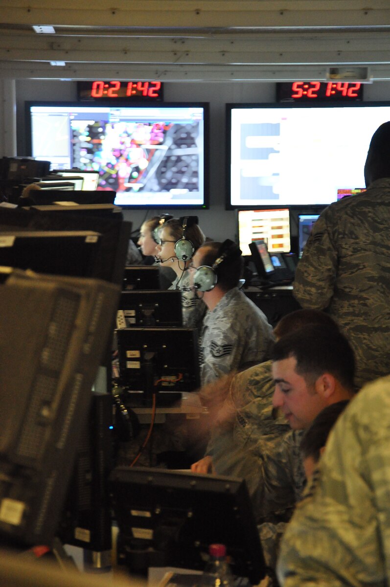 British Air Force Staff Sgt. Daz Finney, air surveillance officer, and Capt. James Ross, mission group battle suite commander, coordinate taskings, Jan. 9. The 71st Expeditionary Air Control Squadron monitors airspace throughout the coalition area of responsibility in Southwest Asia and serve as a failsafe measure for other forward air monitoring services. The outgoing rotation is the final group of air surveillance professionals from Aviano Air Base, Italy, and will return home soon. (U.S. Air Force photo/Master Sgt. Christian Michael)