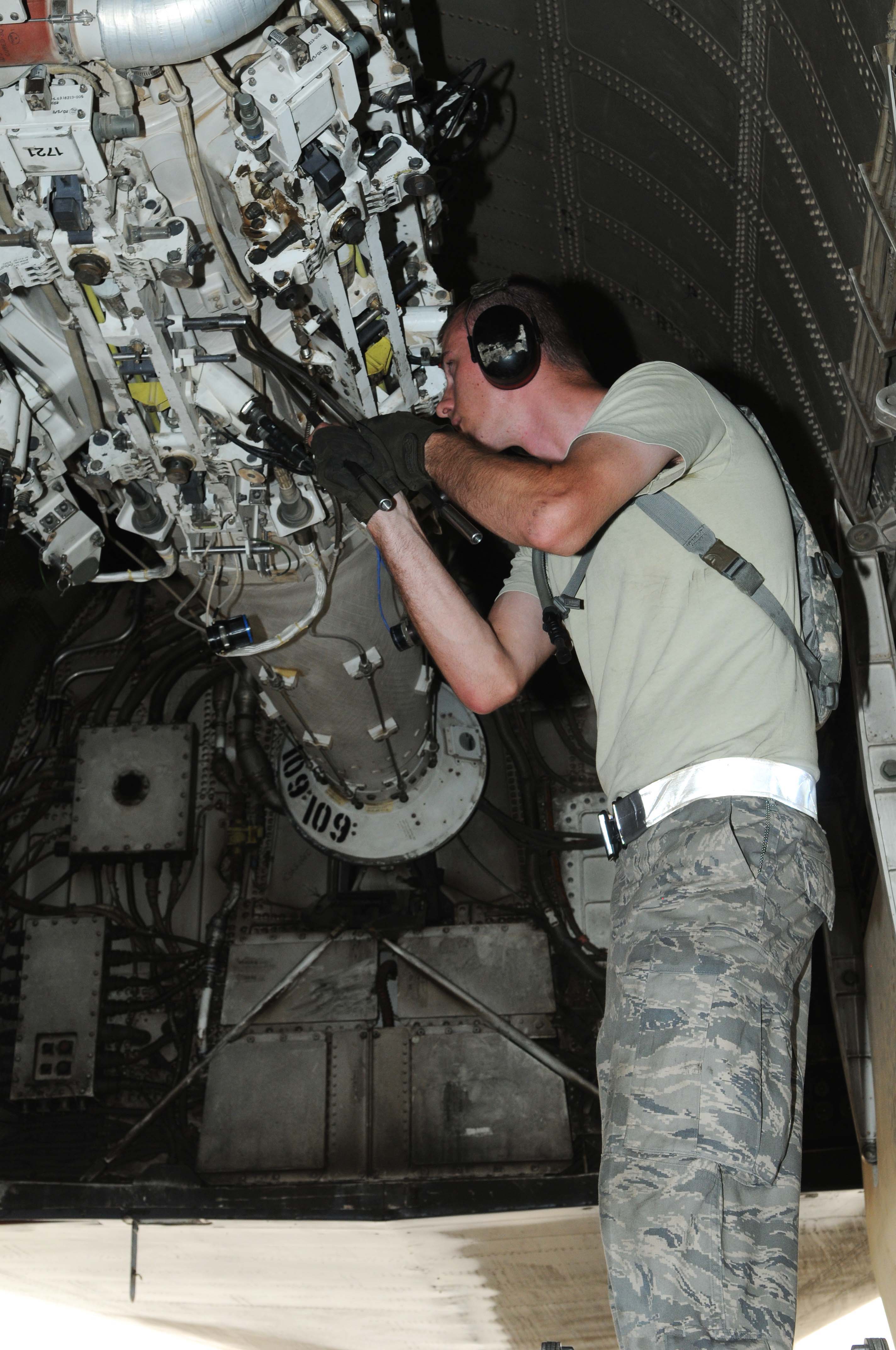 Staff Sgt. John Quiggle and Senior Airman Andrew Pippen from the 379th Expeditionary Aircracft Maintenance Squadron work hand in hand while loading munitions May 12 in Southwest Asia. Sergeant Quiggle and Pippen are both deployed here from Ellsworth Air Force Base, S.D. (U.S. Air Force photo/ Staff Sgt. Anthony Graham)