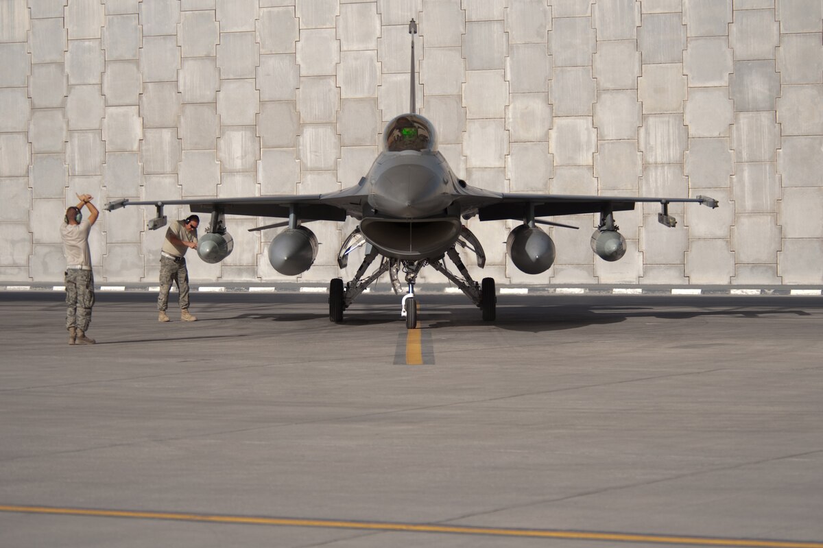Left, U.S. Air Force Airman 1st Class Ted Schaefer, 421st Expeditionary Fighter Squadron crew chief, marshals an F-16 Fighting Falcon to a stop, Oct. 13, 2009, in Southwest Asia. The 379th Air Expeditionary Wing is temporarily hosting the F-16s during the squadron's deployment from Hill Air Force Base, Utah, in support of operation Enduring Freedom. (U.S. Air Force photo/Staff Sgt. Robert Barney/RELEASED)