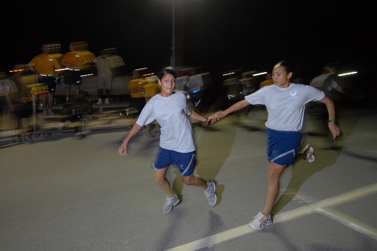 Right, Senior Airman Elain Rodriguez passes the baton to Senior Airman Katrina Oquendo, both supply journeymen assigned to the 379th Expeditionary Logistics Readiness Squadron, during the Commander?s Cup Challenge relay race event here, Aug. 25. The Commander?s Cup Challenge is a 10-event competition designed to build unit and wing esprit de corps among deployed servicemembers. Airman Rodriguez is a native of Seneca, S.C. and is deployed from Aviano Air Base, Italy. Airman Oquendo hails from Twenty Nine Palms, Calif. and is deployed from McGuire Air Force Base, N.J. Both are deployed in support of Operations Iraqi and Enduring Freedom. (U.S. Air Force Photo/Tech. Sgt. Jason W. Edwards)