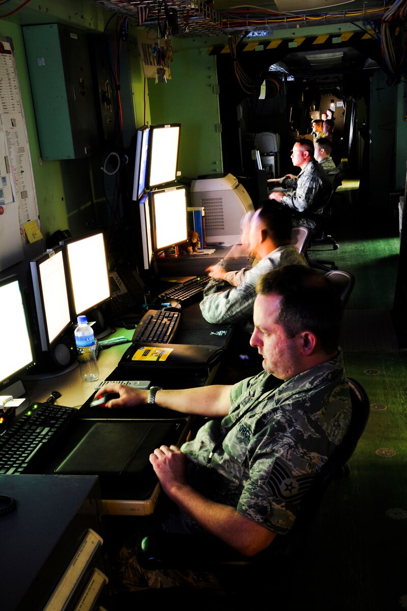 Tech. Sgt. Jason Marks, the Non-Commissioned Officer in Charge of the Combined Air and Space Operations Center (CAOC) Network Infrastructure shop, and Staff Sgt. George Galliguez, a CAOC Network Infrastructure Technician, along with members of the CAOC Communications Support Team, handle the daily missions that each section is in tasked with, Feb. 18, 2009, in an undisclosed location in Southwest Asia. The CAOC's Communications Support Team provides Command and Control Computer Communications and Information network architecture to facilitate air tasking order production, execution, dissemination, and combat operations assessment. Sergeant Marks is native to Mount Dora, Fla. and deployed from Kirtland Air Force Base, N.M. and Sergeant Galliguez hails from Los Angeles, Calif. and is deployed from Davis Monthan AFB, Ariz. The CAOC Communications Support Team is deployed in support of Operations Iraqi and Enduring Freedom and Combined Task Force - Horn of Africa. (U.S. Air Force Photo by Staff Sgt. Joshua Garcia/released)