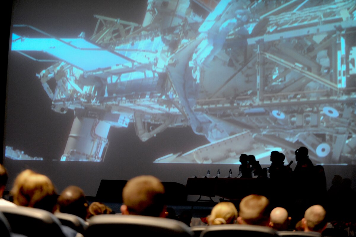 Airman 1st Class Brian Foster and Senior Airman Brandon Mullenix, Munitions Technicians from the 379th Expeditionary Maintenance Squadron, brief the capabilities of the Guided Bomb Unit-38 to United States Navy Captain Christopher Ferguson, a NASA Astronaut, Feb. 2, 2009, in an undisclosed location in Southwest Asia. The Astronauts from the Endeavour STS-126 mission were on base to visit with Airmen of the 379th Air Expeditionary Wing and its Coalition Partners as part of a Armed Forces Entertainment Tour. Airman Foster is native to Ellijay, Ga. and Airman Mullenix hails from Angleton, Texas. Both are deployed from Dyess Air Force Base, Texas in support of Operations Iraqi and Enduring Freedom and Combined Joint Task Force - Horn of Africa. (U.S. Air Force Photo by Staff Sgt. Joshua Garcia/released)