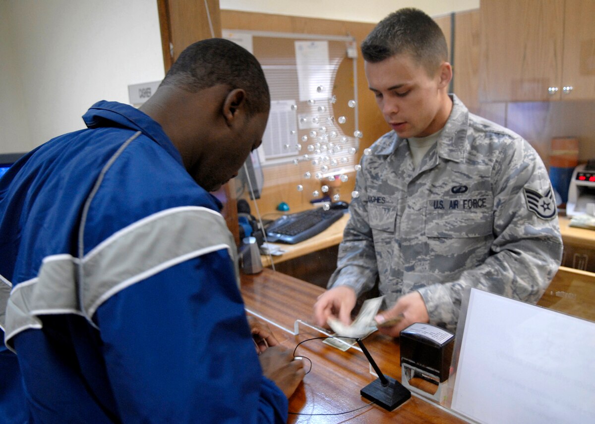 Staff Sergeant Justin Hughes, a 379th Expeditionary Comptrollers Squadron Cashier, counts out cash for a withdrawl for an Airman on base, Jan. 22, 2009, at an undisclosed location in Southwest Asia. Staff Sgt. Hughes assists Airmen with currency exchanges, cashing checks, and making cash withdrawls. Staff Sgt. Hughes hails from Anaconda, Mont. and is deployed from Mountain Home Air Force Base, Idaho in support of Operation Iraqi and Enduring Freedom and Joint Task Force- Horn of Africa. (U.S. Air Force Photo by Airman 1st Class Andrew Satran/Released)
