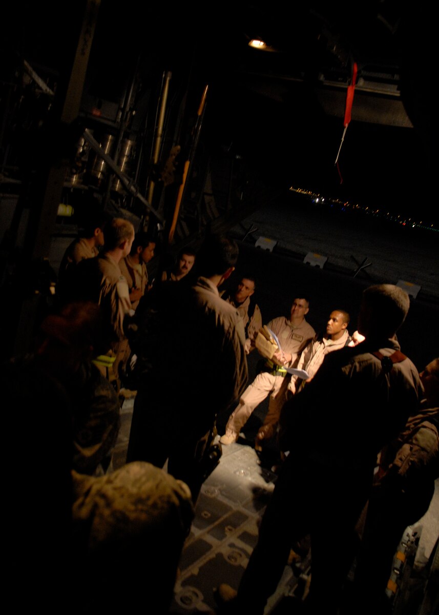 Tech. Sgt. Keith Barker, 379th Expeditionary Aeromedical Evacuation Squadron ground crew NCOIC, and Master Sgt. Michael Granlund, 379 EAES aircrew, secure hooks to hold litters on a C-130 for transporting patients on board, Jan. 11, 2009, at an undisclosed location in Southwest Asia. The ground crew loads medical supplies onto aircraft to support patients being transported in the area of operations in support of Operation Iraqi and Enduring Freedom, and Combined Joint Task Force-Horn of Africa. (U.S. Air Force photo by Airman 1st Class Andrew Satran/Released)