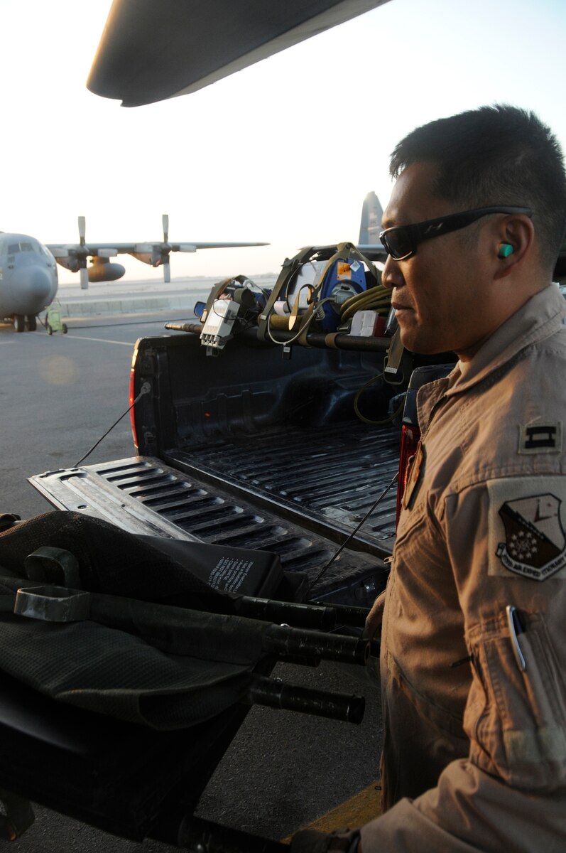 Staff Sgt. Tyronda Summers, an aeromedical evacuation technician and Captains Tim Bougie and Bonnie Tallarita, both flight nurses assigned to the 379th Expeditionary Aeromedical Evacuation Squadron, attach C-130 litter stanchions and straps as part of setting up for an air evacuation of injured personnel Dec. 29, 2008, at an undisclosed air base in Southwest Asia. These EAES members are responsible for evacuating injured personnel from the area of responsibility and providing medical assistance until they arrive at a medical facility. Sergeant Summers, a native of Sioux City, Iowa, is deployed from Ramstein Air Base, Germany. Captain Bougie, a native of Minneapolis, Minn., is deployed from the Minnesota Air National Guard. Captain Tallarita, a native of New Richmond, Wis., is also deployed from the Minnesota Air National Guard. All are assigned to the 379th Expeditionary Aeromedical Evacuation Squadron and deployed in support of Operations Iraqi and Enduring Freedom and Joint Task Force-Horn of Africa. (U.S. Air Force photo by Staff Sgt. Darnell T. Cannady/Released)