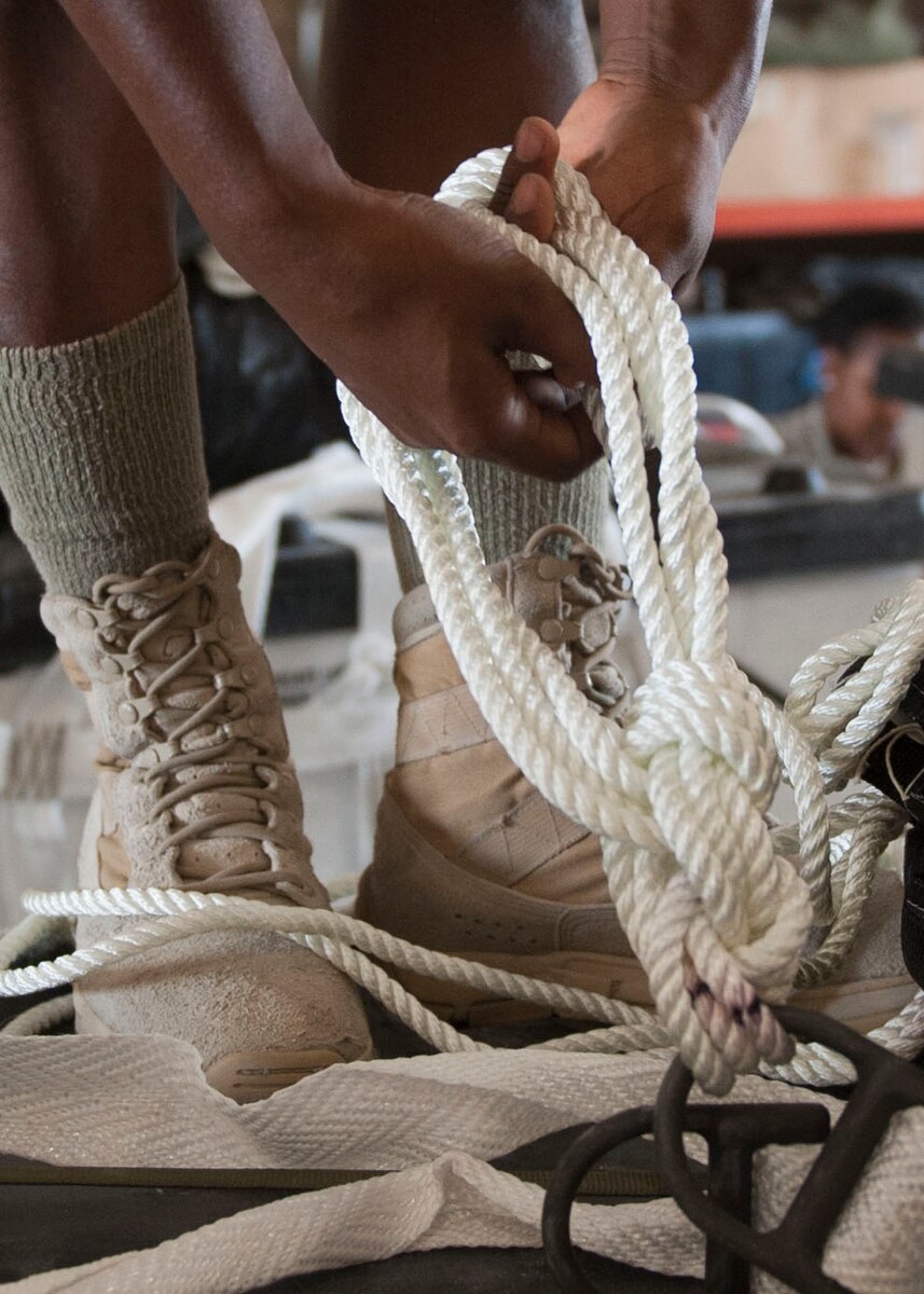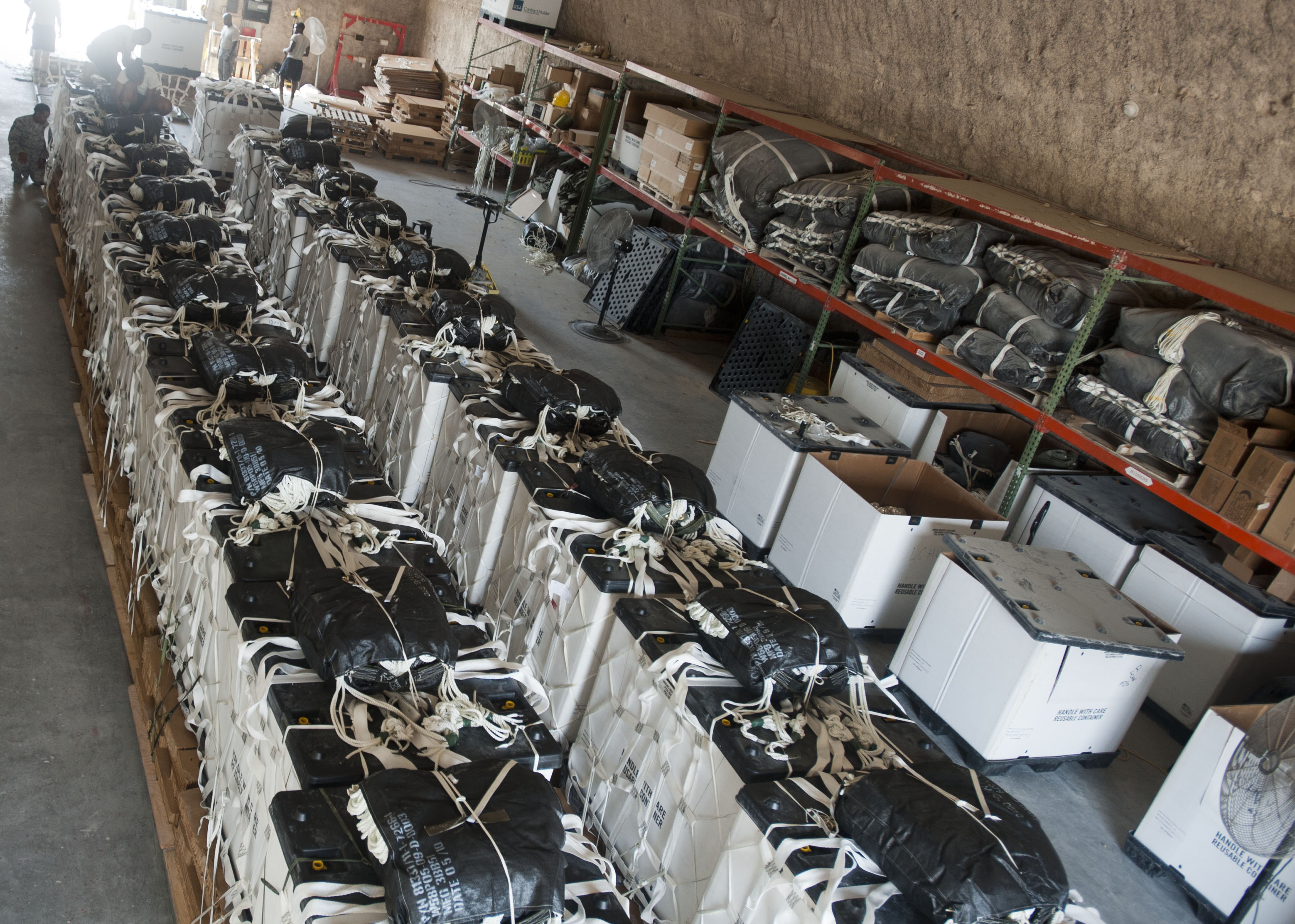 U.S. Army Sgt. Billy Vang, parachutte rigger tightens straps on a pallett at Al Udeid Air Base, Qatar, Aug. 13, 2014. The pallets are being airdropped to displaced citizens in the vicinity of Sinjar, Iraq. Vang is deployed from the 11th Quartermaster Company, Fort Bragg North Carolina and his hometown is Fresno, California. (U.S. Air Force photo by Senior Airman Colin Cates)