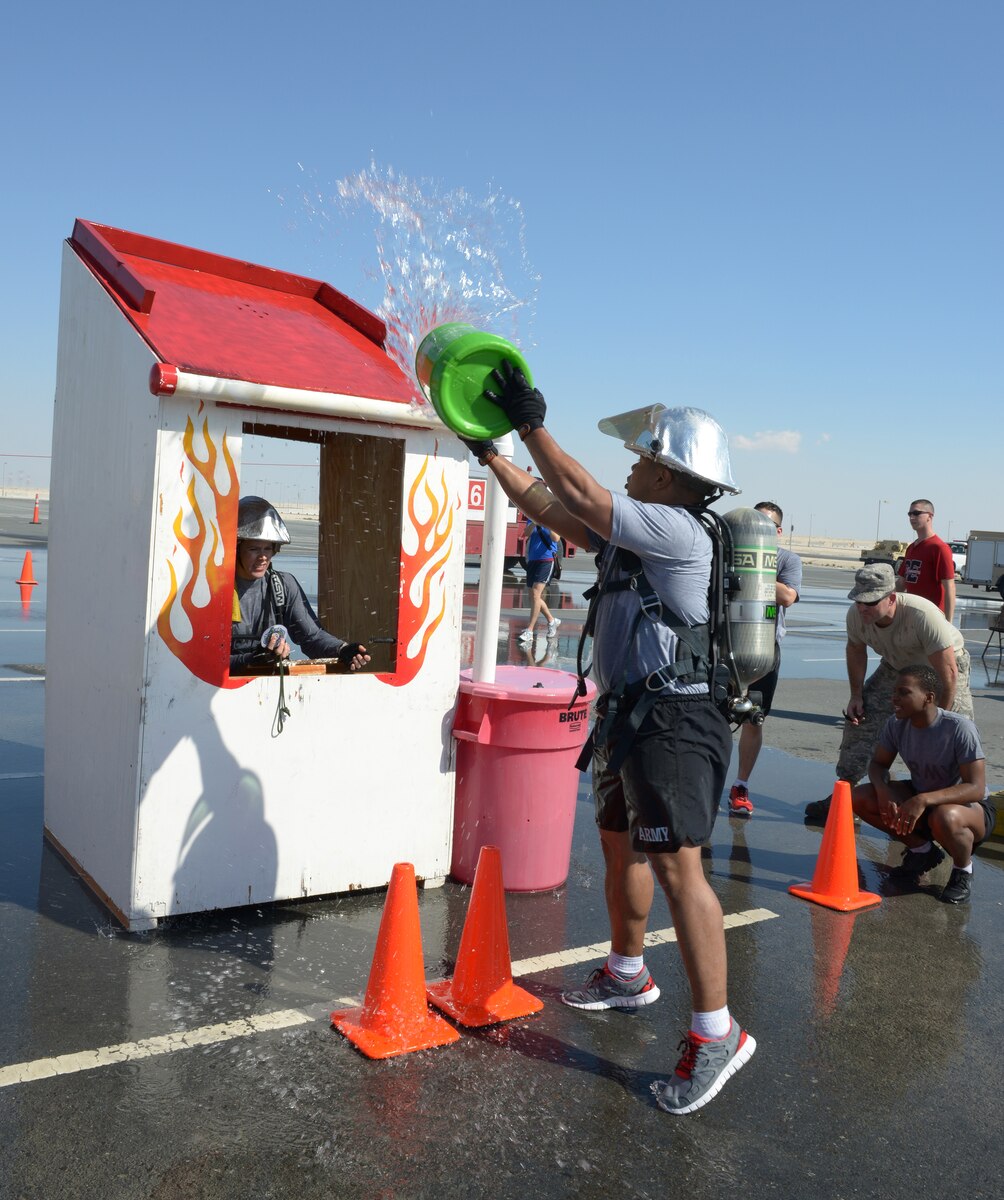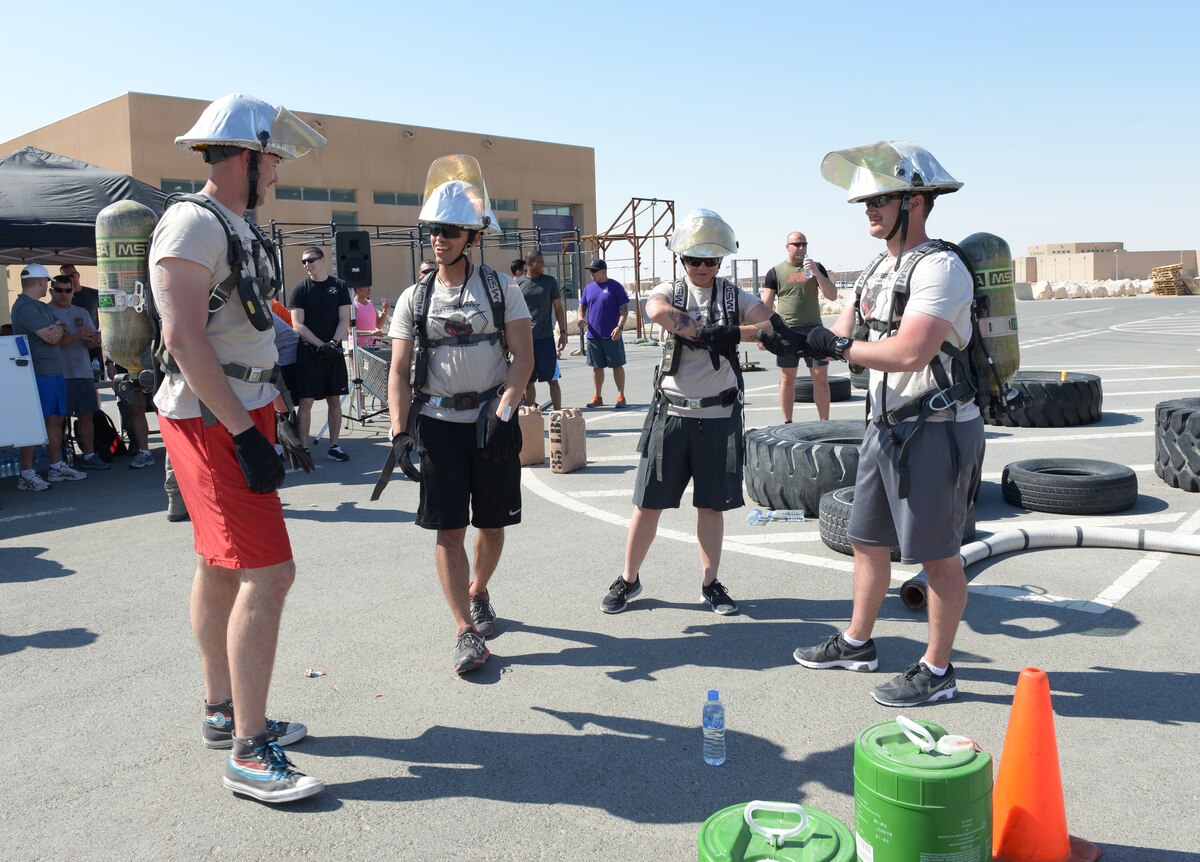 Firefighters from the 379th Expeditionary Civil Engineer Squadron set up for a fire muster at Al Udeid Air Base, Qatar, Feb. 15, 2014. Service members deployed to AUAB competed in a seven station obstacle course to get a taste of some of the training firemen must complete. This is the first fire muster to take place in 2014. (U.S. Air Force photo/Senior Airman Hannah Landeros)