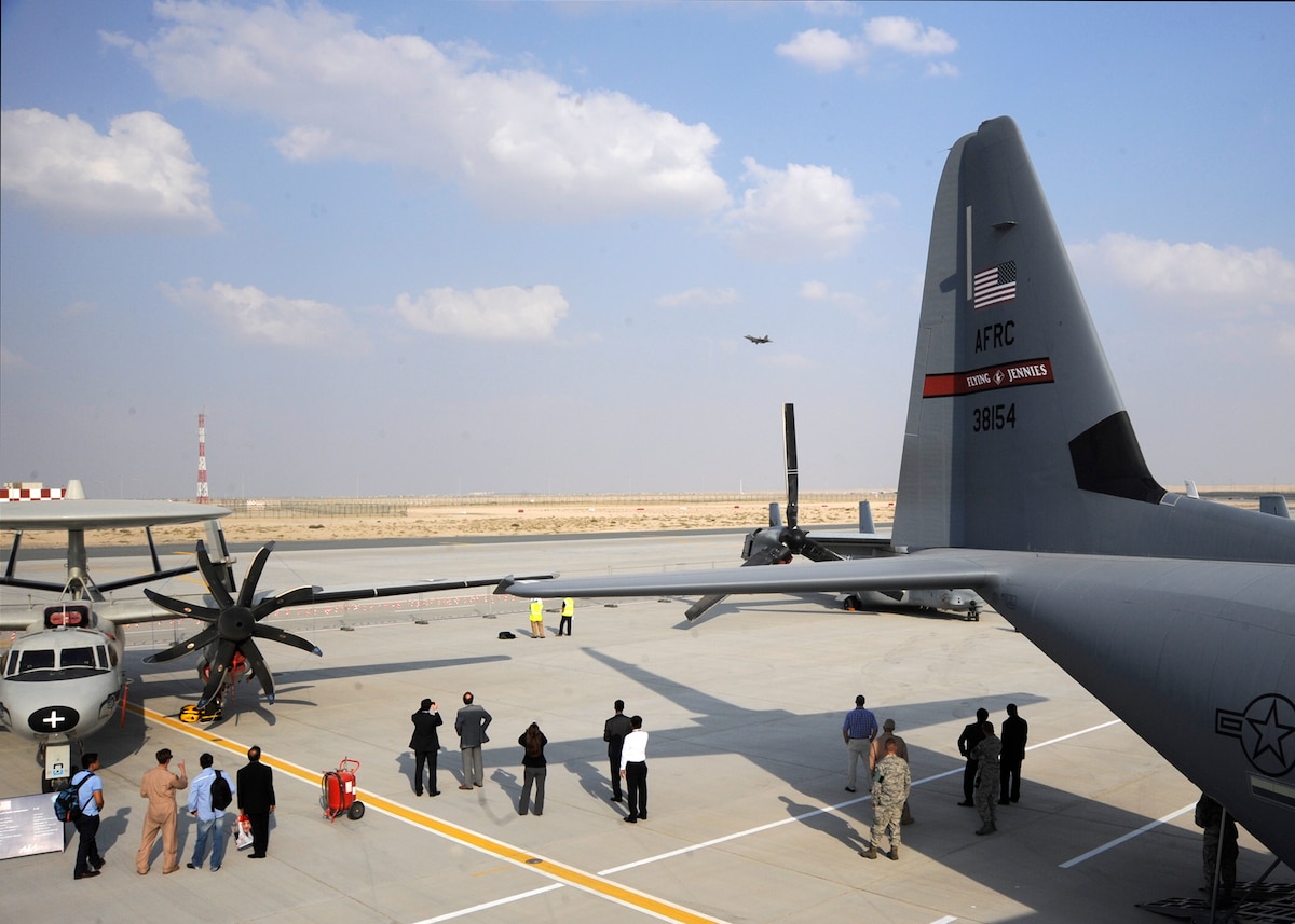 Spectators look on as a B-1B Lancer flies over the 2013 Dubai Airshow at the Dubai World Central airport in Jebel Ali, United Arab Emirates, Nov. 20, 2013. The Lancer is assigned to the 9th Expeditionary Bomb Squadron deployed from Dyess Air Force Base, Texas. The United States participates in the Dubai Air Show to demonstrate a commitment to regional security, to demonstrate the flexibility of airpower, and to strengthen military-to-military relationships with regional partners. (U.S. Air Force photo/Senior Airman Bahja J. Jones)