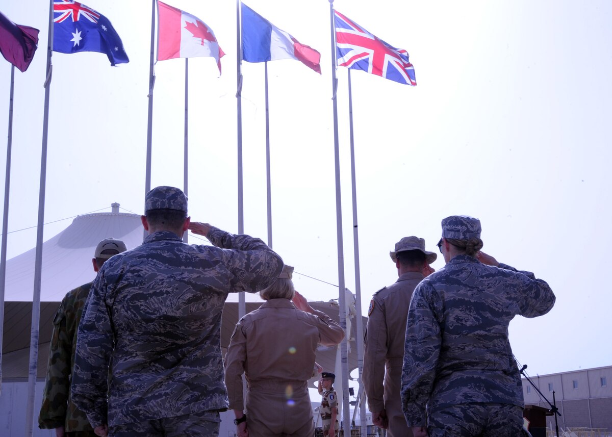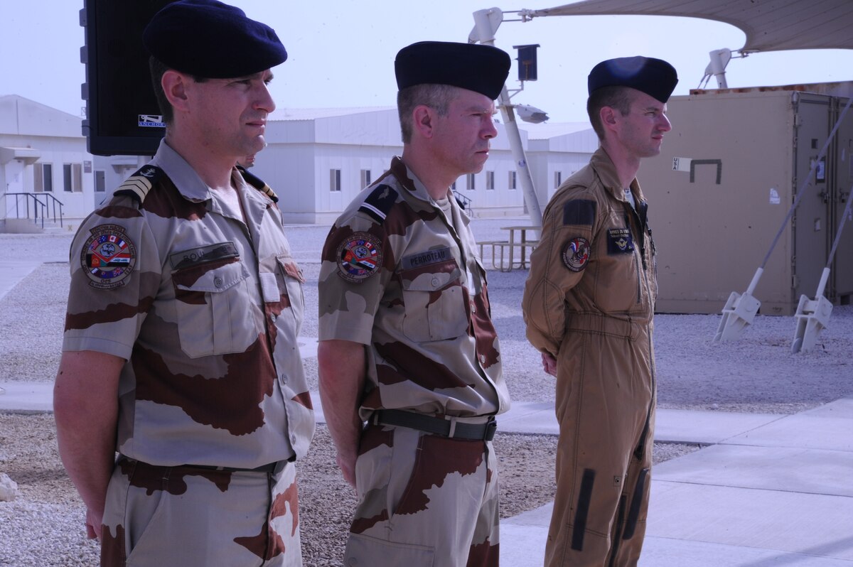 French Air Force Staff Sgts. Axel Michel and Damien Aubert raise the French flag at a Bastille Day ceremony during the 379th Air Expeditionary Wing, July 14, 2013. The taking of Bastille in 1789 signaled the beginning of the French Revolution. Michel and Aubert are Combined Air and Space Operations Center French Detachment telecommunications technicians. (U.S. Air Force photo/Senior Airman Bahja J. Jones)