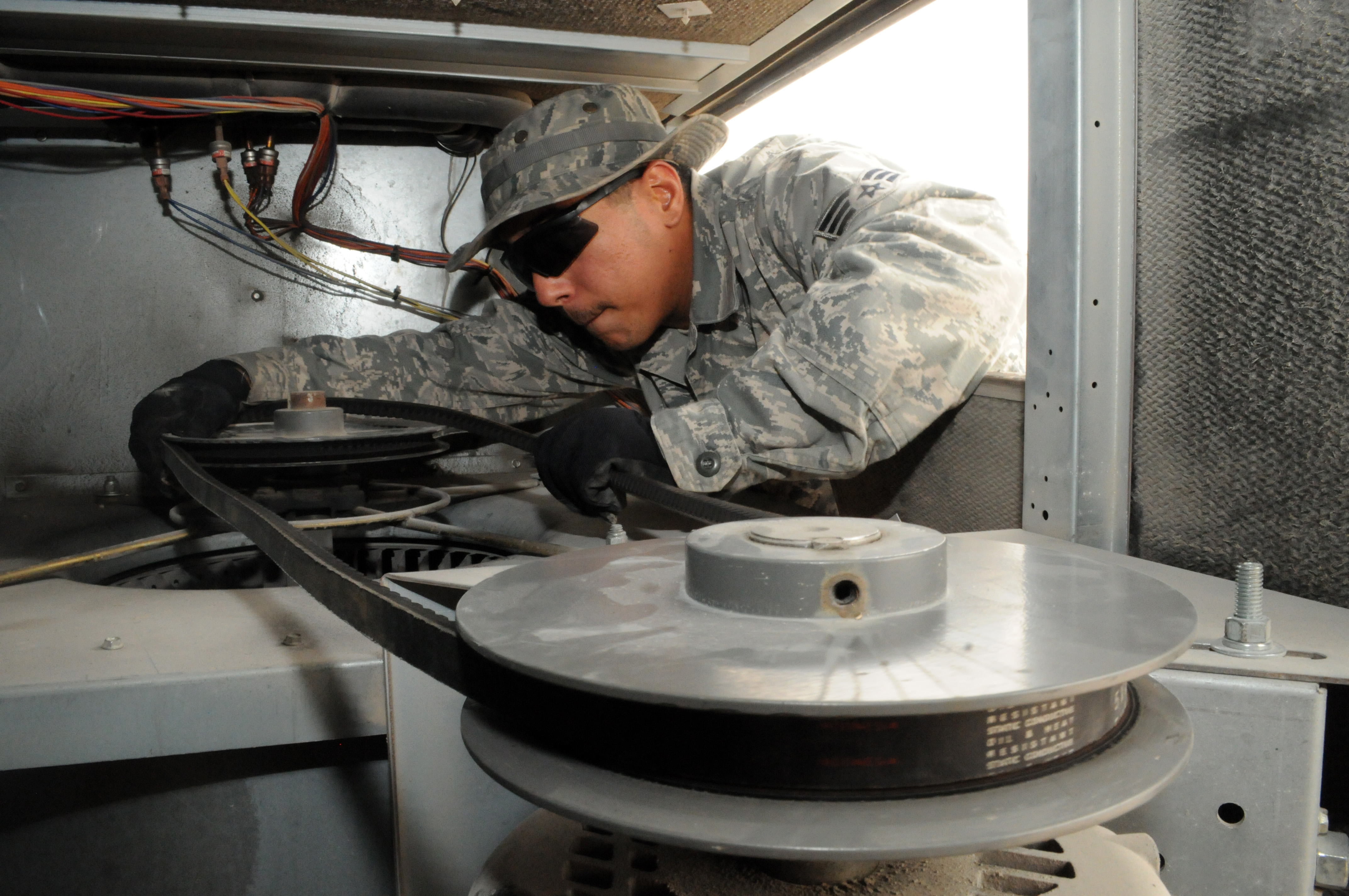 SOUTHWEST ASIA -- Senior Airman Dick Rodriguez replaces a broken fan belt found while doing recurring maintenance on an air conditioning unit, March 21. The 379th Expeditionary Civil Engineer Squadron Heating Ventilation Air Conditioning / Refrigeration shop maintains all wing and tenant HVAC/R systems on base. (U.S. Air Force photo/Master Sgt. Christian Michael)