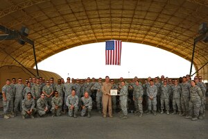 Col. James Copher, 380th Air Expeditionary Wing vice commander, presented Senior Airman Kasey Clive, 380th Expeditionary Maintenance Squadron, a warrior of the week certificate at an undisclosed location in Southwest Asia, May 28, 2014. Clive, a native of Indianapolis, Ind., is deployed from Royal
