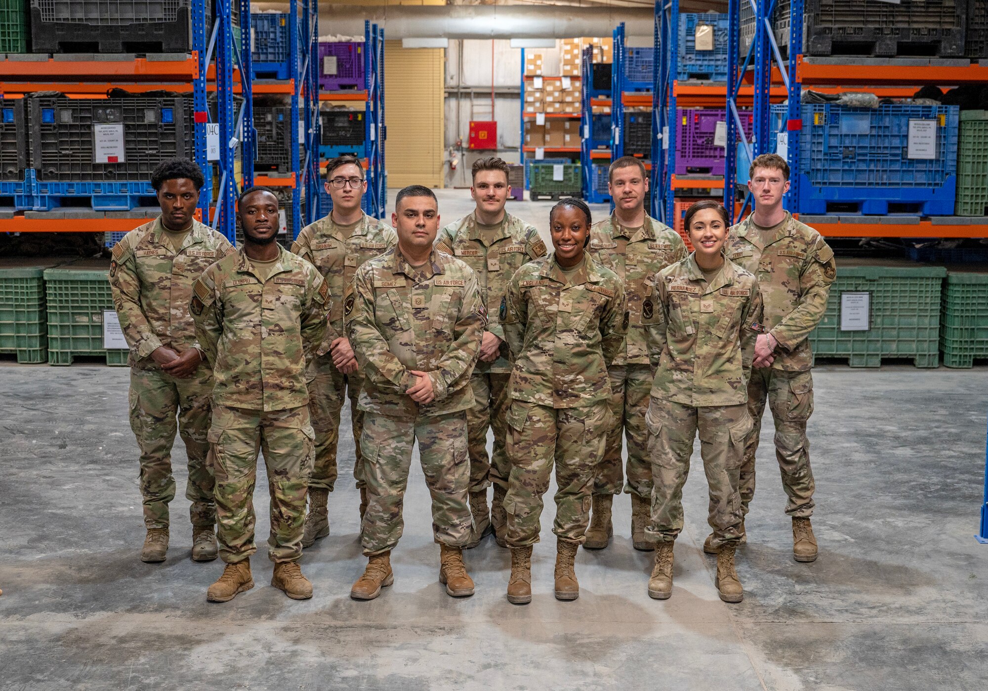 U.S. Air Force Senior Airman Delicia England, right, and Airman 1st Class Zechariah Haynes, middle, 380th Expeditionary Logistics Readiness Squadron Individual Protective Equipment journeymen, check in a customer’s IPE gear at Al Dhafra Air Base, United Arab Emirates, Sept. 26, 2023. The IPE section stores and supplies personnel with chemical warfare defense equipment, individual body armor, and small arms and light weapons. (U.S. Air Force photo by Tech. Sgt. Alex Fox Echols III)