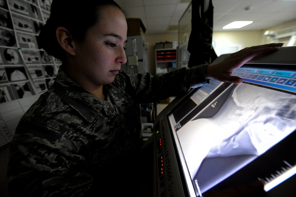 U.S. Air Force Senior Airman Desirae Echeverri, 380th Medical Group diagnostic imagery technologist, goes over a patient’s X-ray at an undisclosed location in Southwest Asia, May 14, 2013. Echeverri uses X-rays to check for any abnormalities that may be present in the bones. Echeverri is a native from Belleview, Fla., and is deployed from Lackland Air Force Base, Texas. (U.S. Air Force photo by Staff Sgt. Joshua J. Garcia)