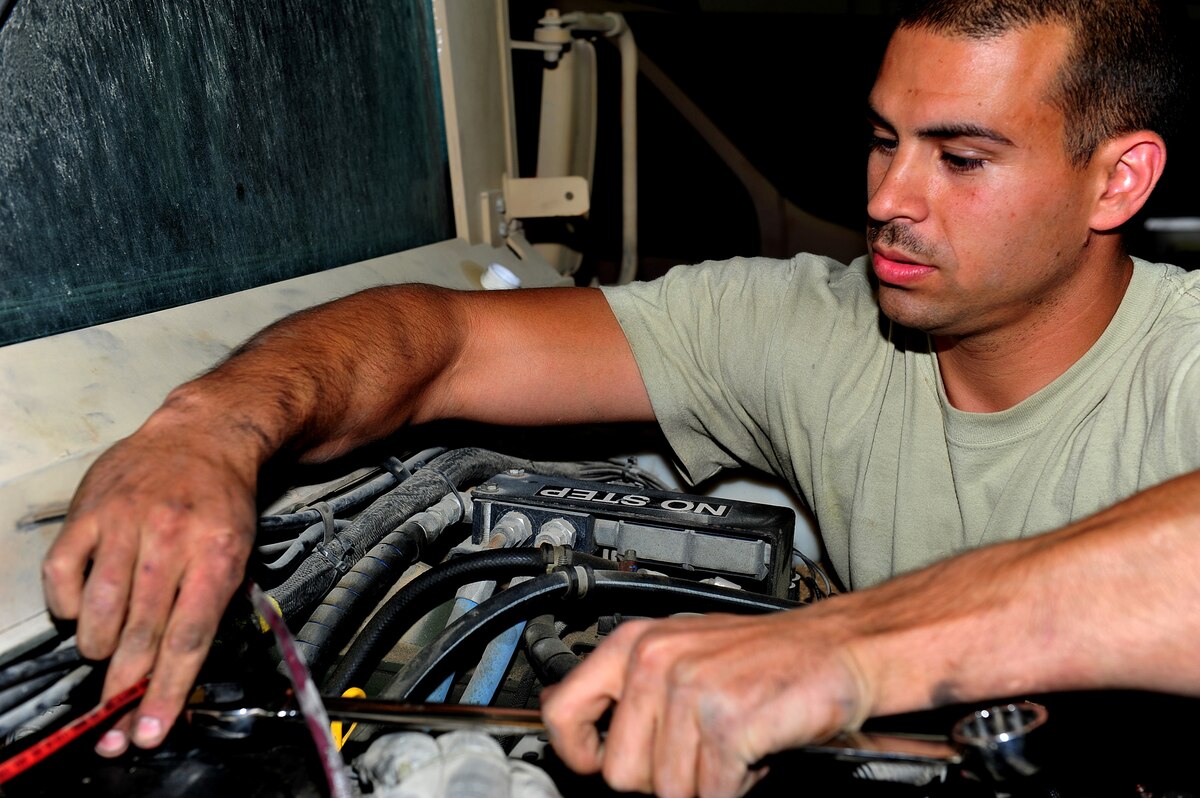 U.S. Air Force Staff Sgt. Joseph Leitch, 380th Logistics Readiness Squadron special material handling equipment craftsman, and Airman 1st Class Travis Martin, 380 LRS vehicle maintenance journeyman, marshal Airman 1st Class Gabriel Ignacio, 380 LRS special material handling equipment journeyman, as they replace the side shift and roll cylinder on a 25K Next Generation Small Loader at an undisclosed location in Southwest Asia Mar. 5, 2013. The vehicle maintenance shop service and repair more than 500 vehicles each month. Leitch is deployed from McGuire Air Force Base, N.J. and Martin and Ignacio are deployed from Cannon AFB, N.M. (U.S. Air Force photo by Tech. Sgt. Christina M. Styer/Released)