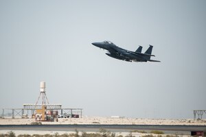 Sept. 18, 2019 ADAB Strike Eagles demonstrate agility and enhance regional defense An F-15E Strike Eagle, assigned to the 336th Expeditionary Fighter Squadron, takes off for Agile Strike Sept. 18, 2019, at Al Dhafra Air Base, United Arab Emirates. The 336th EFS sent two aircraft and personnel to operate missions out of Prince Sultan Air Base, Saudi Arabia to challenge their
