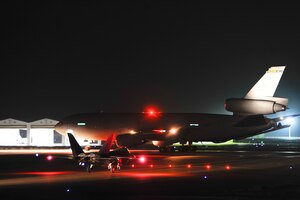 An U.S. Air Force KC-10 Extender and a F-22 Raptor assigned to the 380th Air Expeditionary Wing, Al Dhafra Air Base, Unite Arab Emirates taxi down the runway before departing on a mission in support of Operation Inherent Resolve, Feb. 13, 2018. The name Inherent Resolve is intended to reflect the