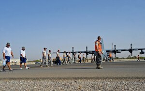 Aug. 16, 2010 386th Airmen walk the walk Approximately 250 Airmen from the 386th Air Expeditionary Wing participate in a quarterly Foreign Object Damage walk on the base airfield here Aug. 14, 2010. The event is held quarterly to ensure trash and other debris remains clear of the airfield, preventing damage to aircraft engines. View the