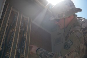 Sept. 26, 2018 Rock Solid Warrior - SSgt. Nathan Pederson U.S. Air Force Staff Sgt. Nathan Pederson, 386th Expeditionary Communications Squadron client systems supervisor, examines communications equipment Sept. 16, 2018 at an undisclosed location in Southwest Asia. One of Pederson’s deployment goals is to reach the 1,000 pound club at the gym. (U.S. Air