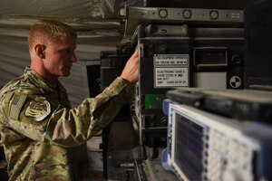 Aug. 24, 2018 Rock Solid Warrior - Staff Sgt. Jerod Hay Staff Sgt. Jerod Hay, 441st Air Expeditionary Squadron Combat Communications Radio Frequency Transmissions non-commissioned officer in-charge, demonstrates a piece of communication equipment Aug. 17, 2018, at an undisclosed location in Southwest Asia. Hays was recognized as the 386th Air