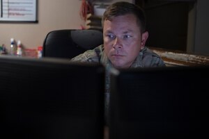 Sept. 4, 2018 Rock Solid Warrior - Staff Sgt. Chad Weaver U.S. Air Force Staff Sgt. Chad Weaver, 386th Expeditionary Security Forces Squadron BDOC controller, monitors his computers screens Aug. 13, 2018, at an undisclosed location in Southwest Asia. Weaver is an avid hunter and fisherman. (U.S. Air Force photo by Staff Sgt. Joshua King)