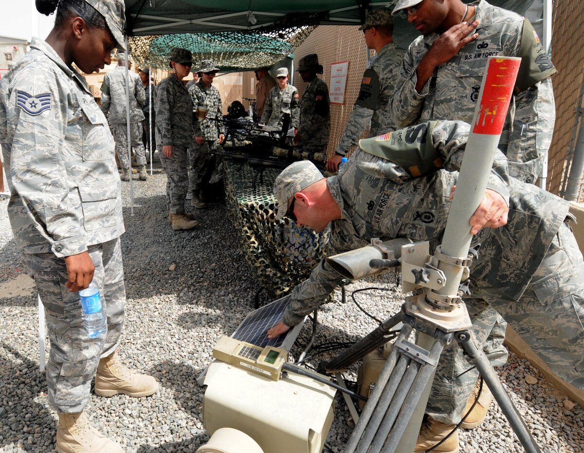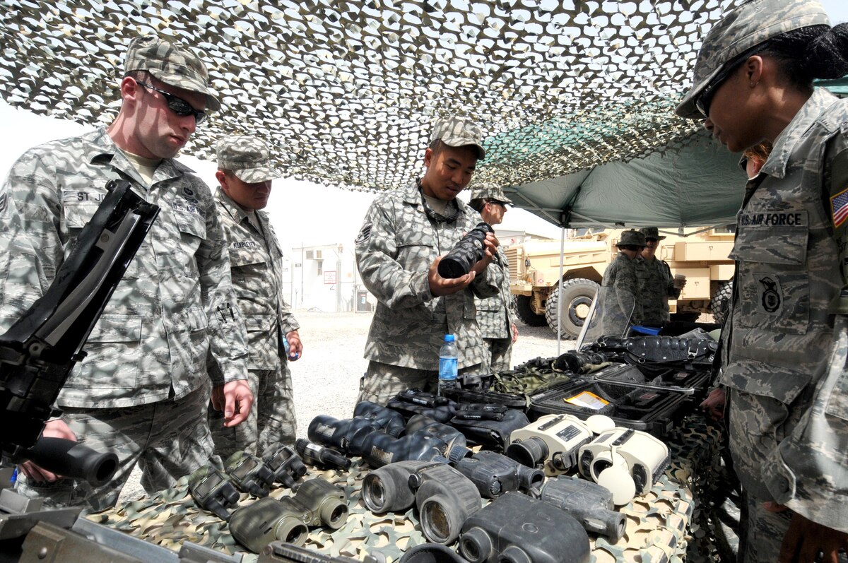 Senior Airman Samuel Beavers, a Defender with the 386th Expeditionary Security Forces Squadron, shows Chief Master Sgt. Nathalie Swisher, 386th Expeditionary Mission Support Group superintendent, the proper wear of riot gear May 11 at an undisclosed location in Southwest Asia. (U.S. Air Force photo by Staff Sgt. Patrice Clarke)