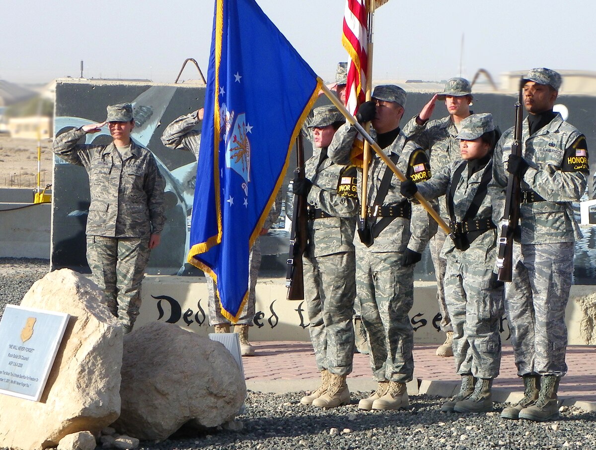 SOUTHWEST AISA -- Members of the 386th Air Expeditionary Wing Honor Guard mark the start of every ceremony here with a precisely choreographed display of military protocol, perfected through countless hours of drill. The 45-member team is continuing to grow thanks to a high level of participation. (U.S. Air Force photo by Senior Airman Laura Turner)
