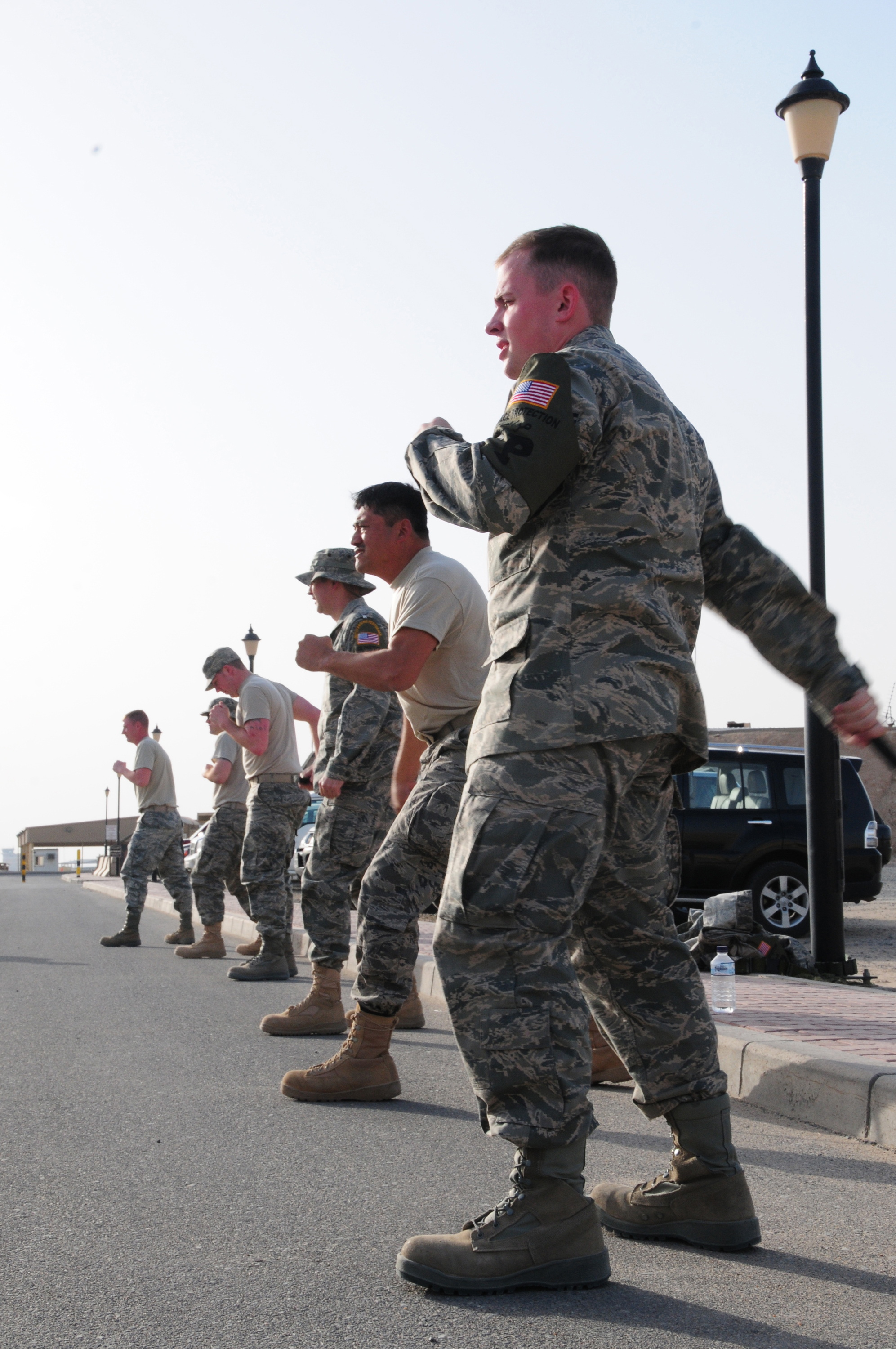 U.S. Air Force Staff Sgt. Matthew Heenan, left, and Senior Airman Joshua Dillman, both members of the 386th Expeditionary Security Forces Squadron Force Protection flight, demonstrate the proper stance and strike technique during a force protection asp training session Feb. 9, 2010 at an air base in Southwest Asia. The course is designed to prepare Airmen to handle any hostile situation that may arise during their time downrange. (U.S. Air Force photo by Staff Sgt. Lakisha A. Croley/Released)