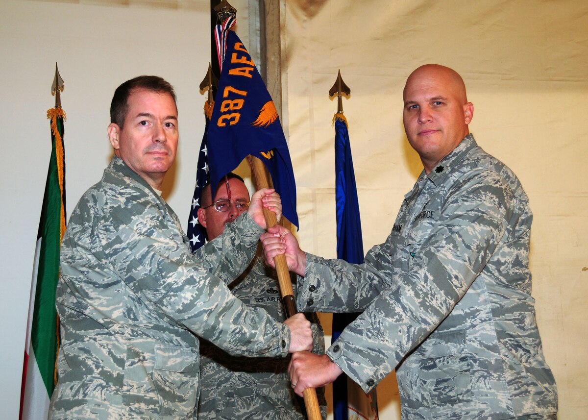SOUTHWEST ASIA -- Lt. Col. Charles Perham assumes command of the 387th Expeditionary Support Squadron, by accepting the guidon from Col. Randy Davis, 387th Air Expeditionary Group commander, during a change of command ceremony at an air base in Southwest Asia Nov. 29, 2009. (U.S. Air Force photo/Tech. Sgt. Tony Tolley)